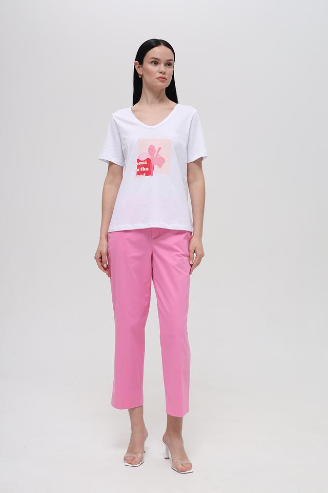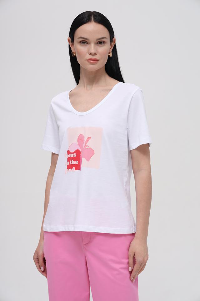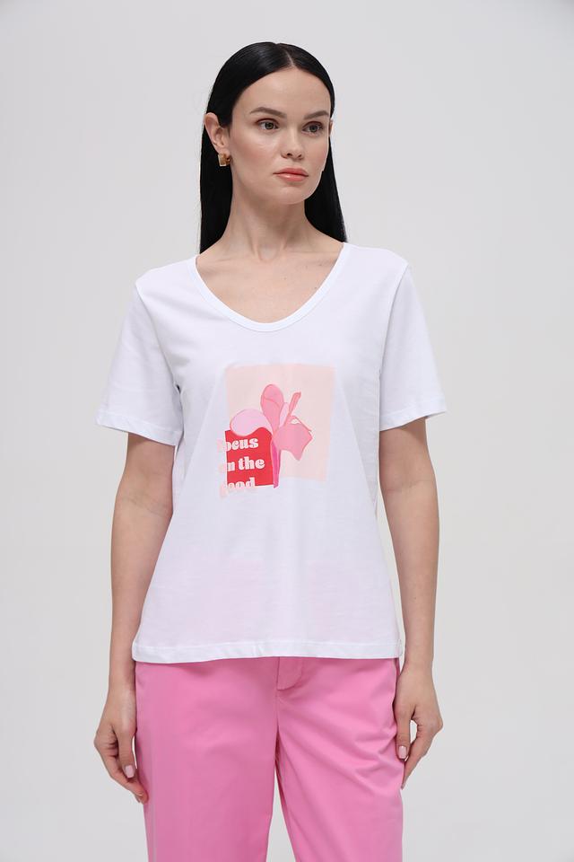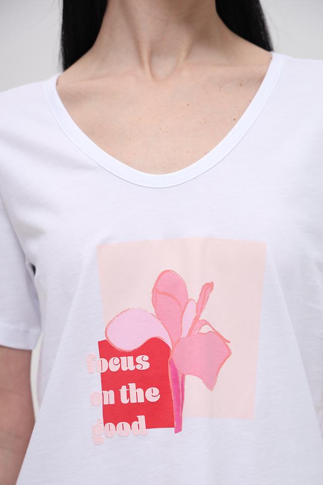 Особенностью данной модели является оригинальный принт с изображением цветка в ярких розовых и красных тонах. Принт расположен в центре футболки и придает ей индивидуальность и свежий вид.