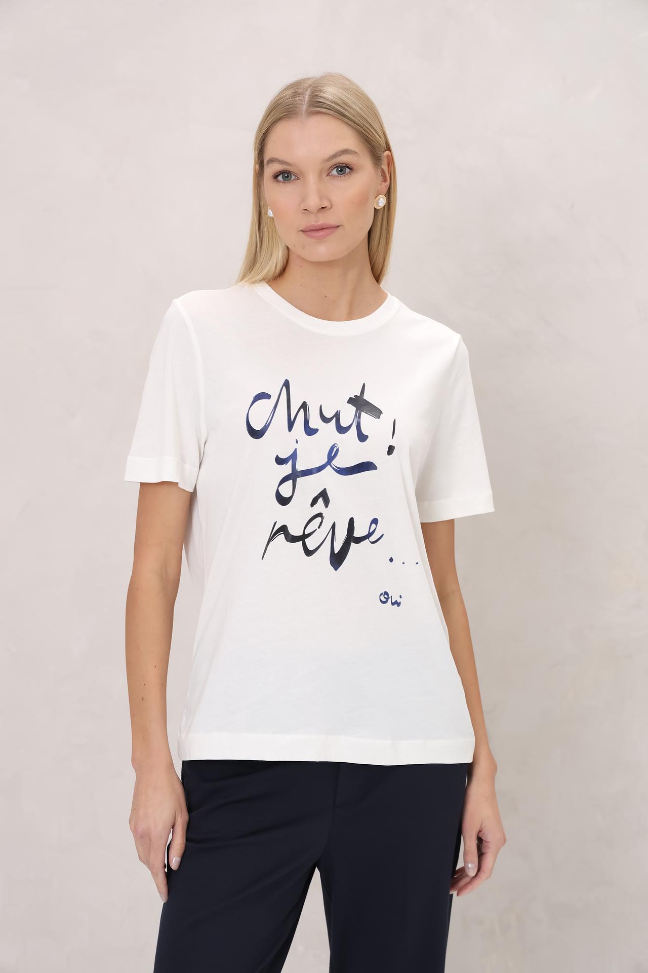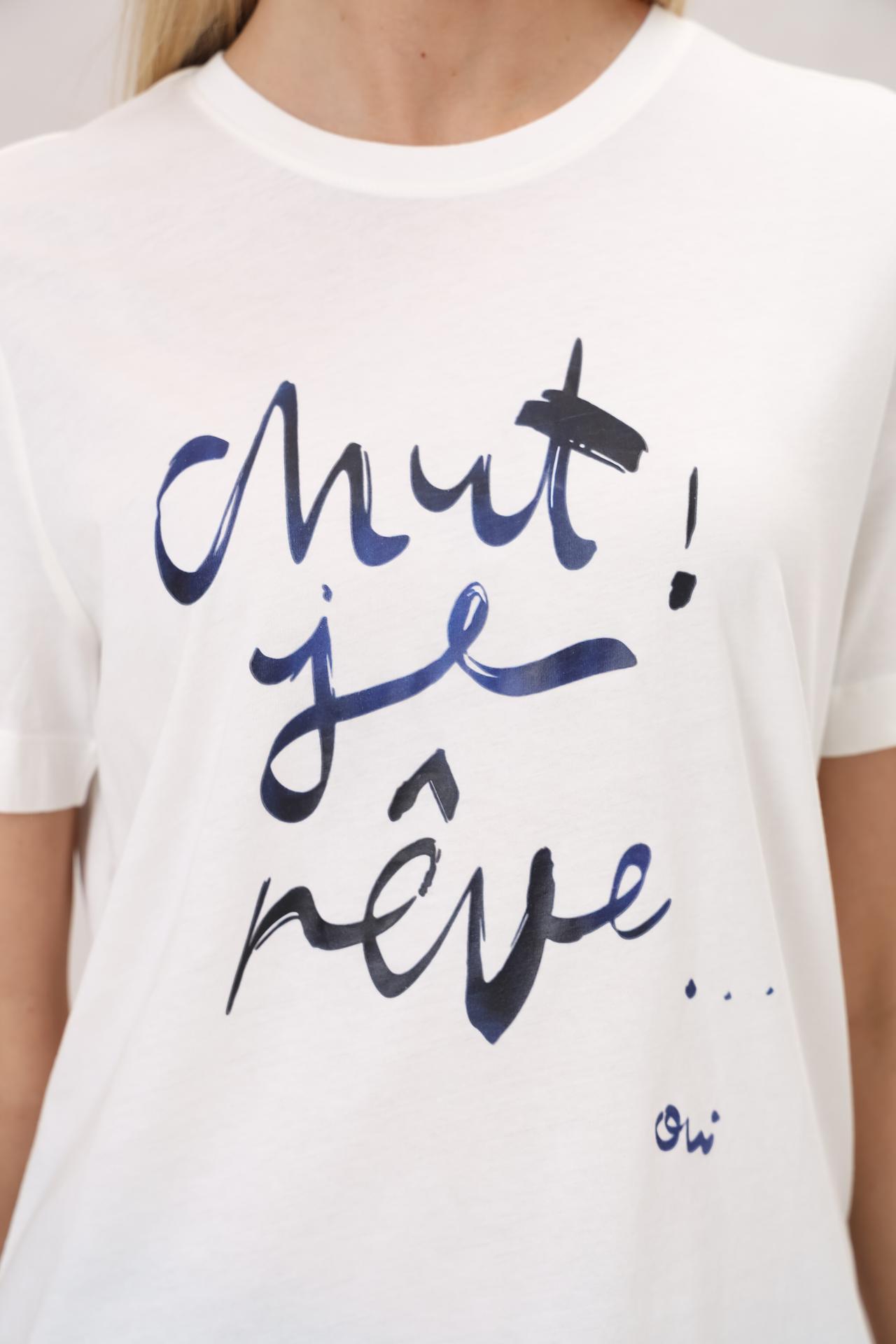 Базовая белая футболка от Oui – идеальный выбор для создания расслабленных, но стильных образов. Мягкий и приятный к телу 100% хлопок обеспечивает комфорт в течение всего дня. Футболка с короткими рукавами украшена оригинальной надписью, придающей модели индивидуальность.