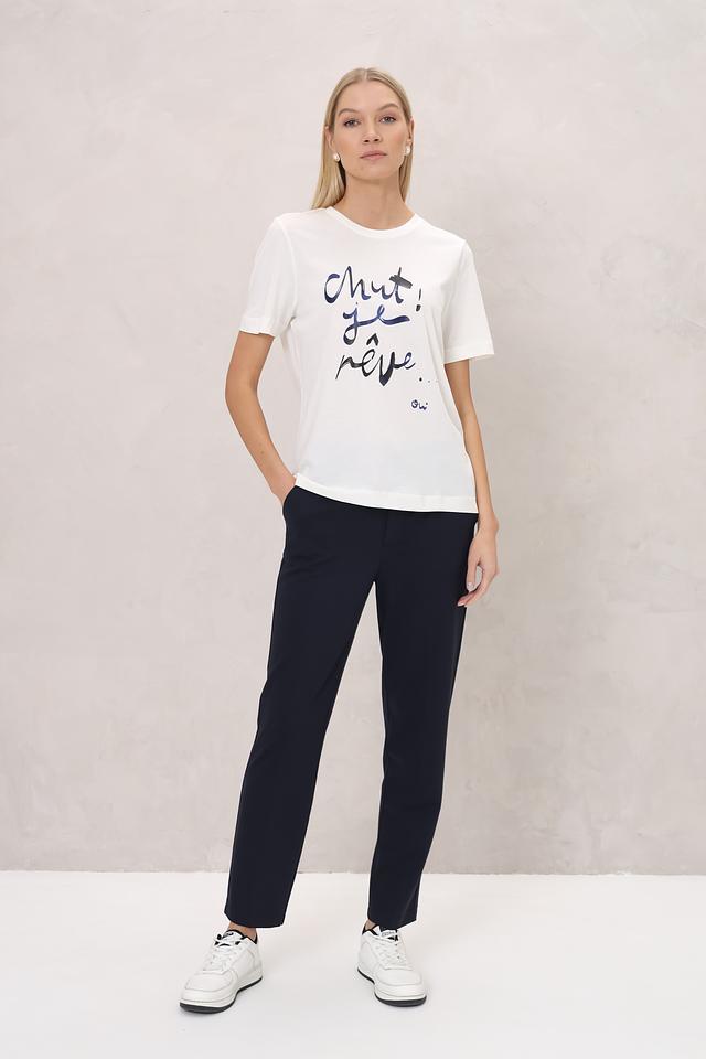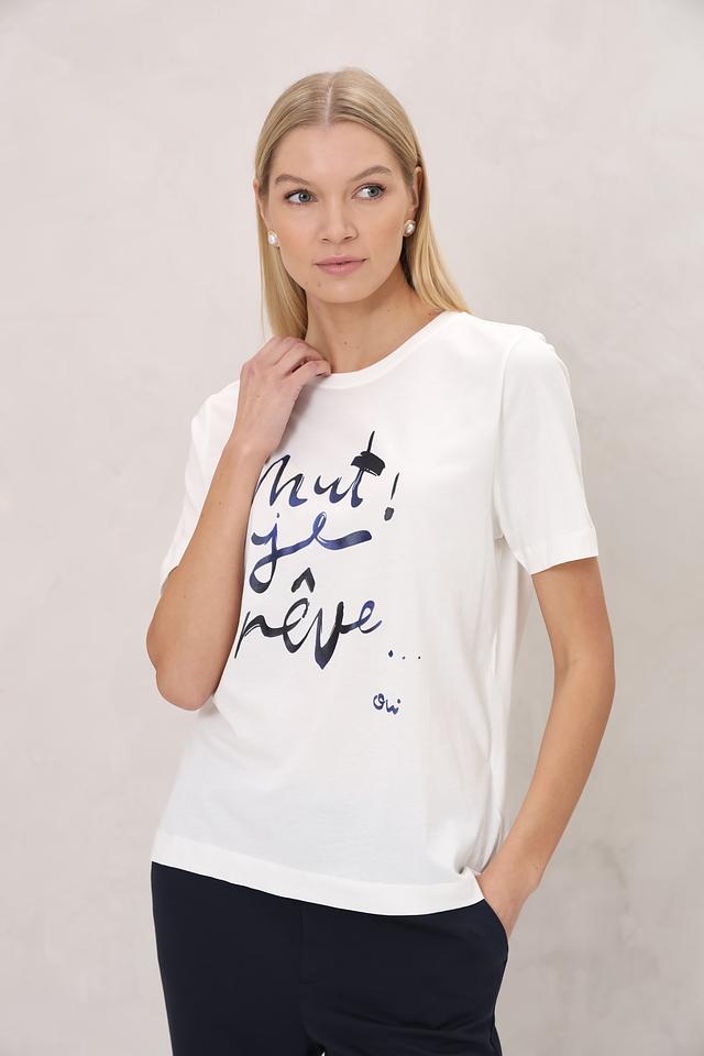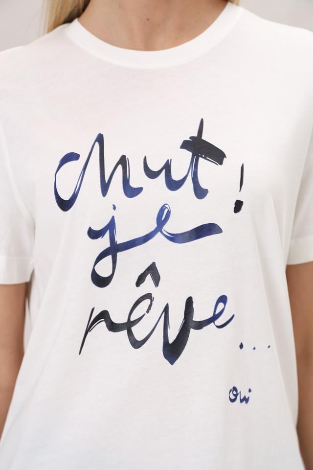 Белая футболка от Oui с оригинальным принтом "Chut! je rêve...". Изготовлена из 100% хлопка, обеспечивая комфорт и воздухопроницаемость. Стильный и лаконичный дизайн делает эту футболку отличным выбором для повседневного образа. Состав: хлопок 100%
