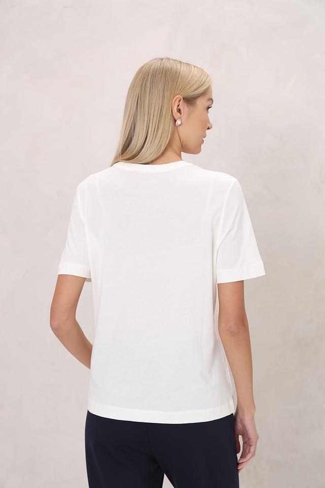 Футболка имеет прямой крой, короткие рукава и круглый вырез горловины. Она идеально подходит для создания повседневных образов, легко сочетается с джинсами, брюками или юбками.