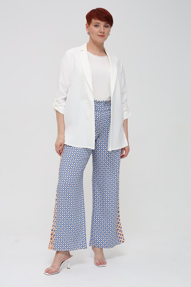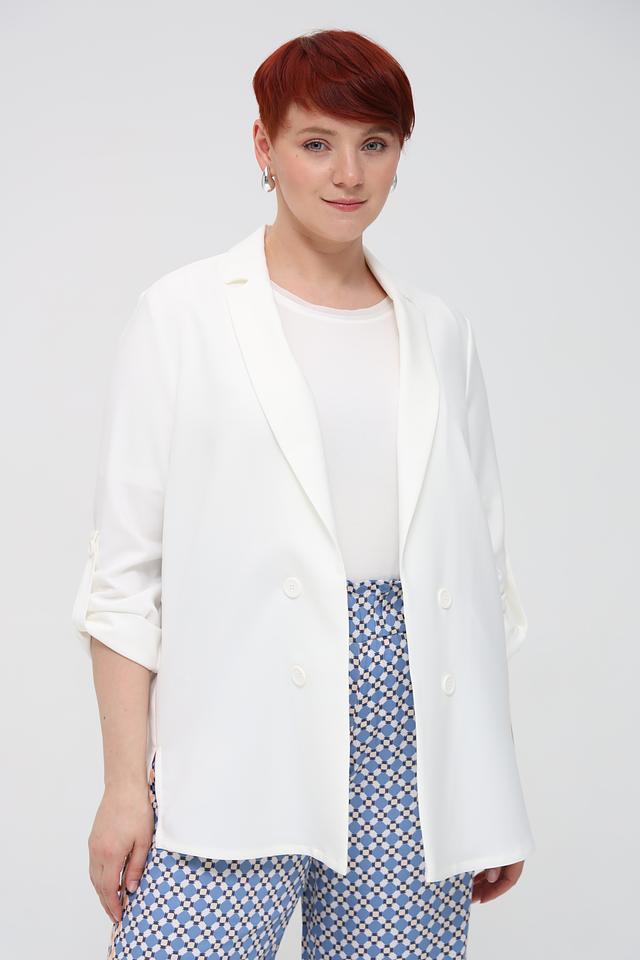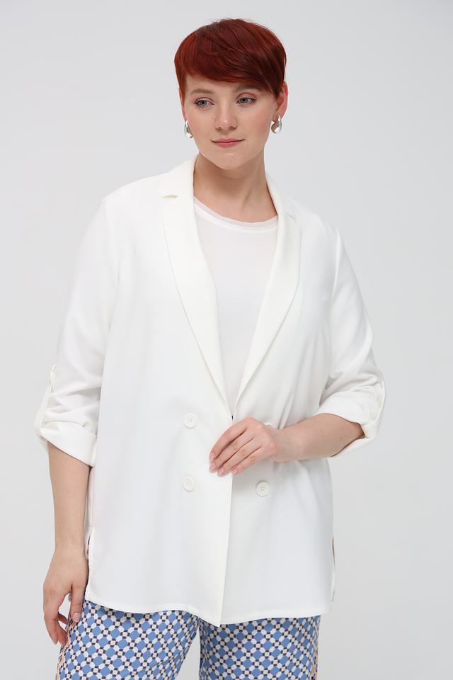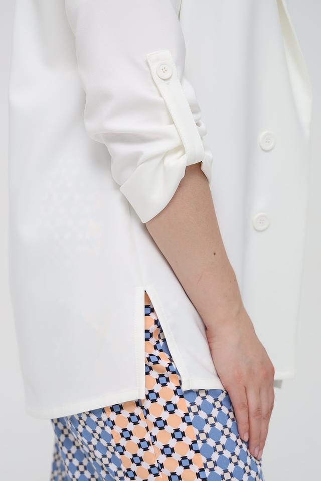 Жакет имеет прямой крой, который подчеркивает фигуру, не сковывая движений. Застежка на две пуговицы позволяет регулировать посадку по фигуре. Рукава 3/4 с небольшим отворотом добавляют образу изысканности.