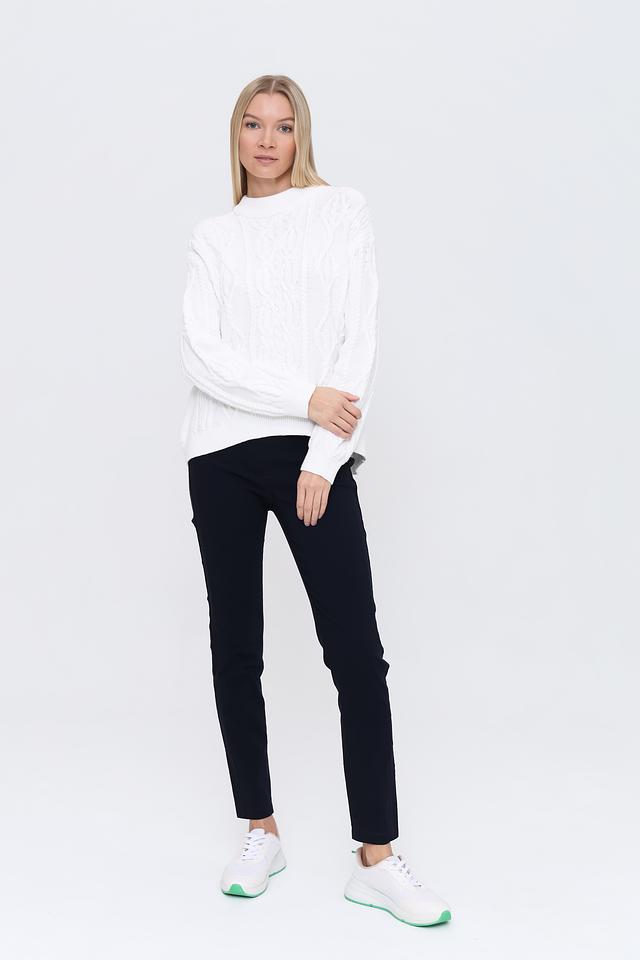 Основной цвет пуловера – белый, что делает его универсальным элементом гардероба, легко сочетаемым с различными вещами. Выразительный узор из кос добавляет изделию текстуру и визуальный интерес.
