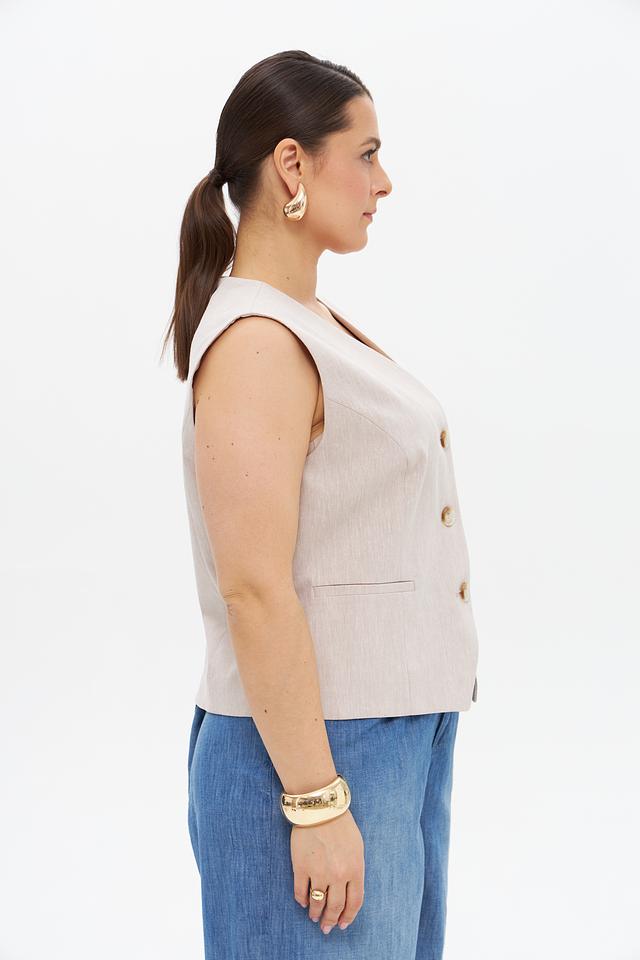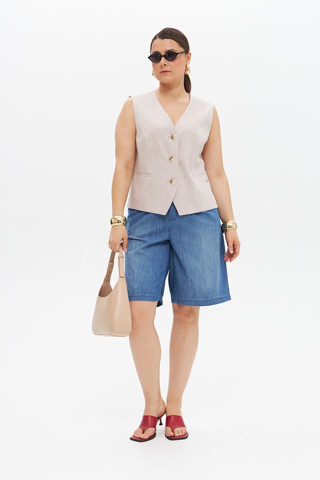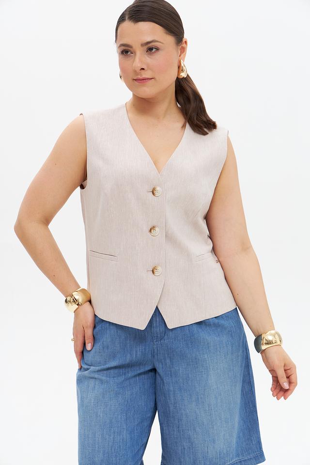 Бежевый жилет от Betty and Co – стильный элемент гардероба, выполненный из смесовой ткани. Сочетает в себе лен, хлопок, вискозу и переработанный полиэстер, обеспечивая комфорт и воздухопроницаемость. Состав: переработ.полиэстер 31%, лен 28%, хлопок 22%, вискоза 17%, эластан 2%
