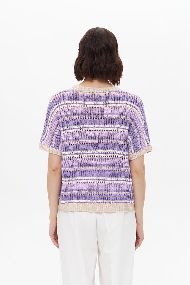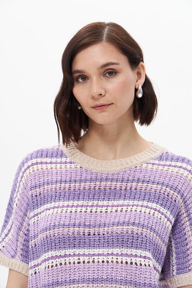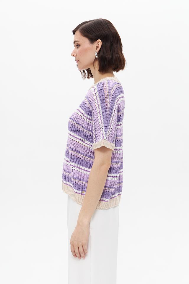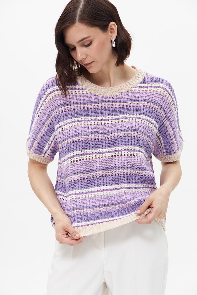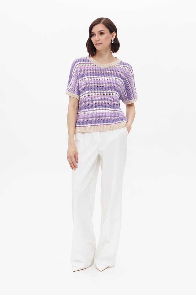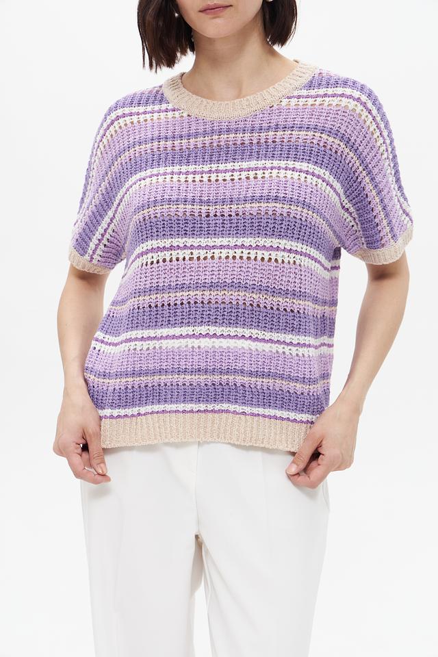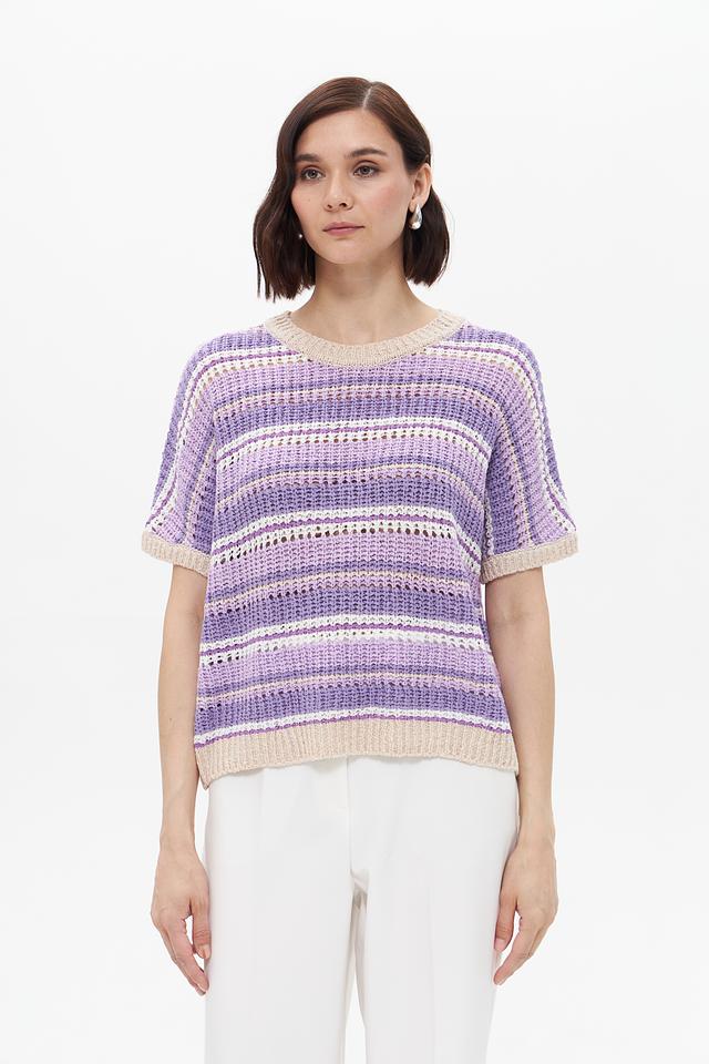 Женский пуловер Betty and Co лавандового цвета с короткими рукавами выполнен в полоску. Модель имеет свободный крой и круглый вырез горловины, что делает ее универсальным дополнением к вашему гардеробу. Состав: полиакрил 63%, полиамид 37%