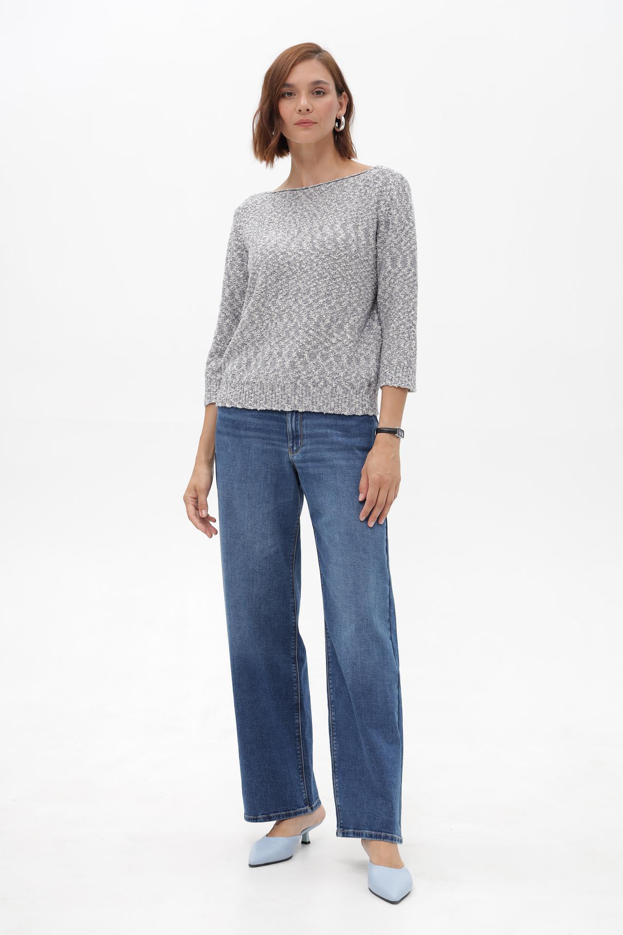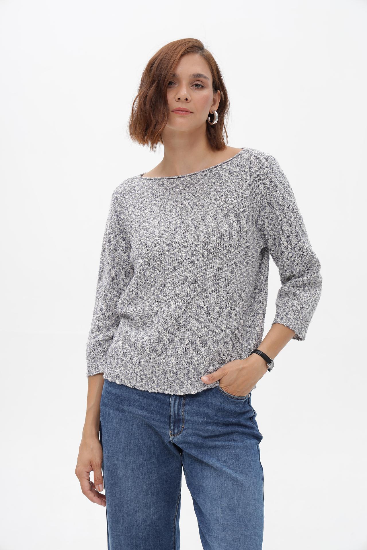 - Дизайн: Классический крой с элегантным вырезом «лодочка» и рукавами три четверти делает этот пуловер универсальным для создания разнообразных образов. Меланжевая текстура вязки придает изделию особую привлекательность.