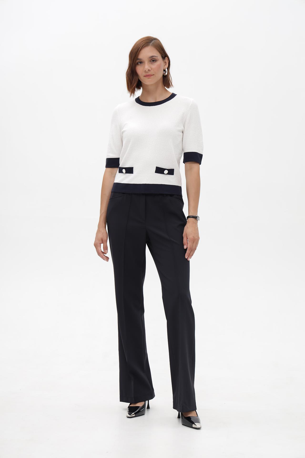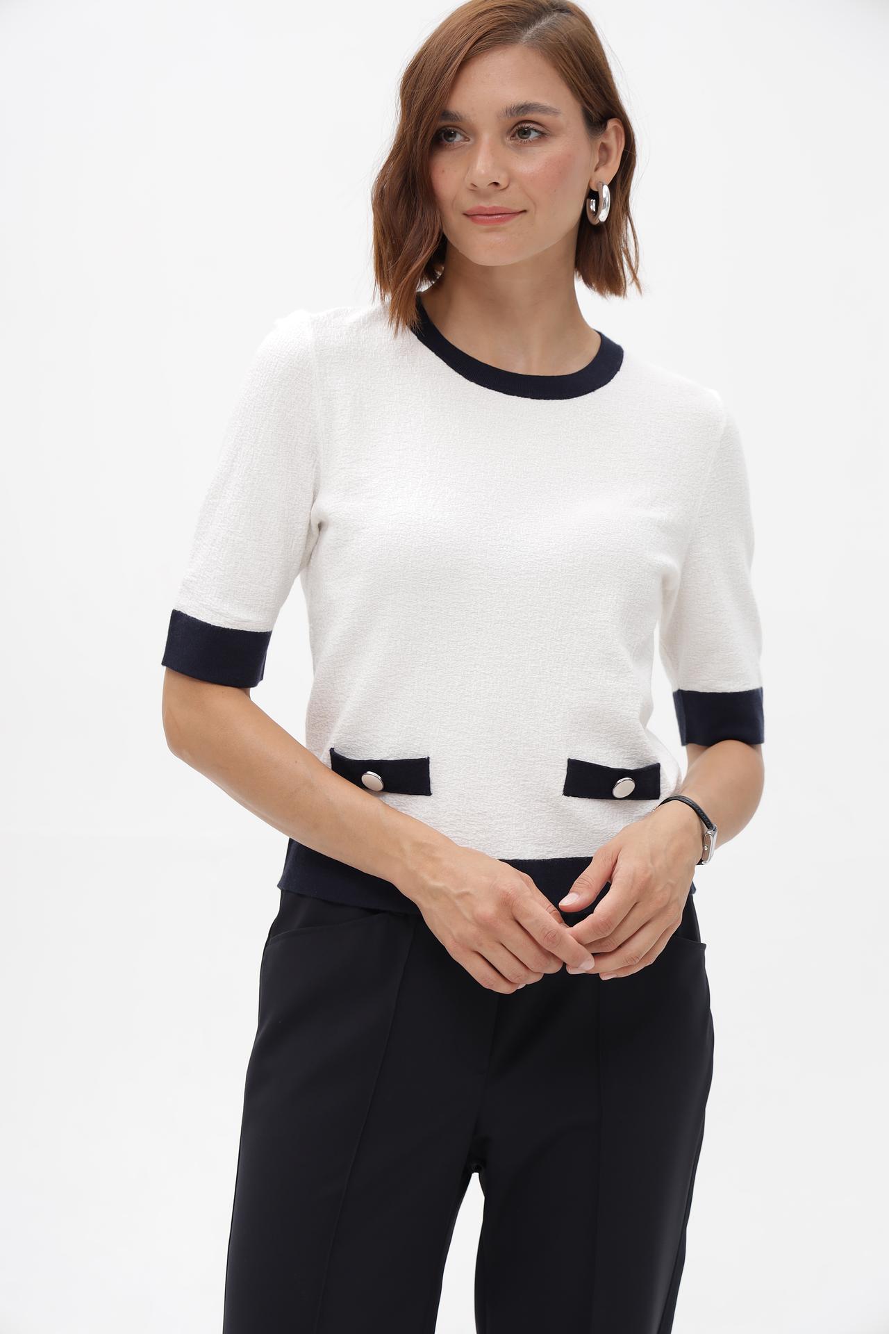 - Дизайн и отделка: Пуловер имеет круглый вырез и короткие рукава, контрастирующие с основным белым цветом. Декоративные накладные карманы с темно-синей окантовкой и пуговицами на передней части изделия придают модели элегантности и завершенности.