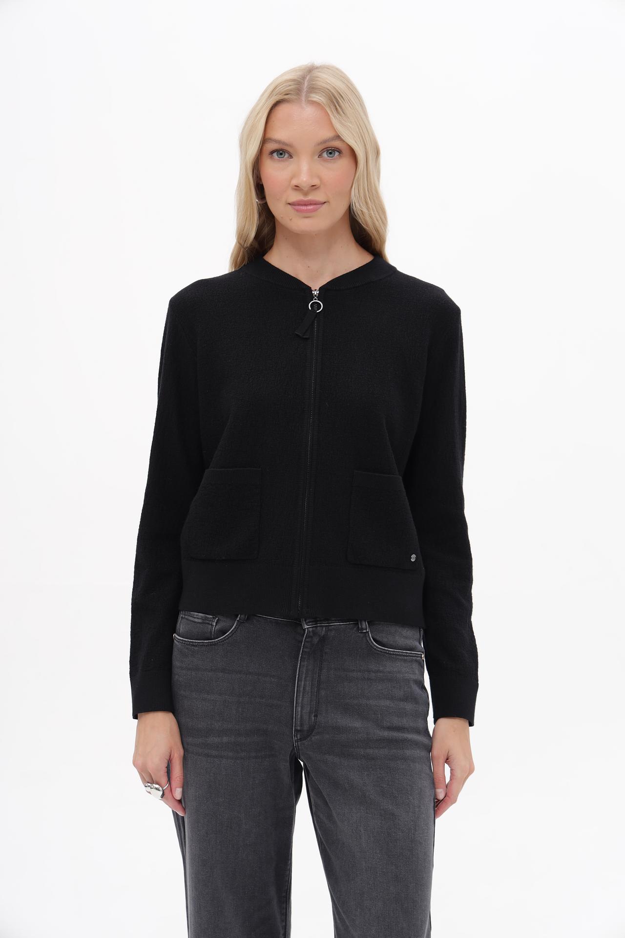 Классический жакет от Betty and Co — идеальное дополнение к вашему гардеробу. Модель выполнена в универсальном черном цвете, который легко сочетается с любыми другими оттенками. Жакет застегивается на молнию, что придает ему современный и стильный вид. Он отлично подойдет как для повседневных образов, так и для более элегантных выходов.