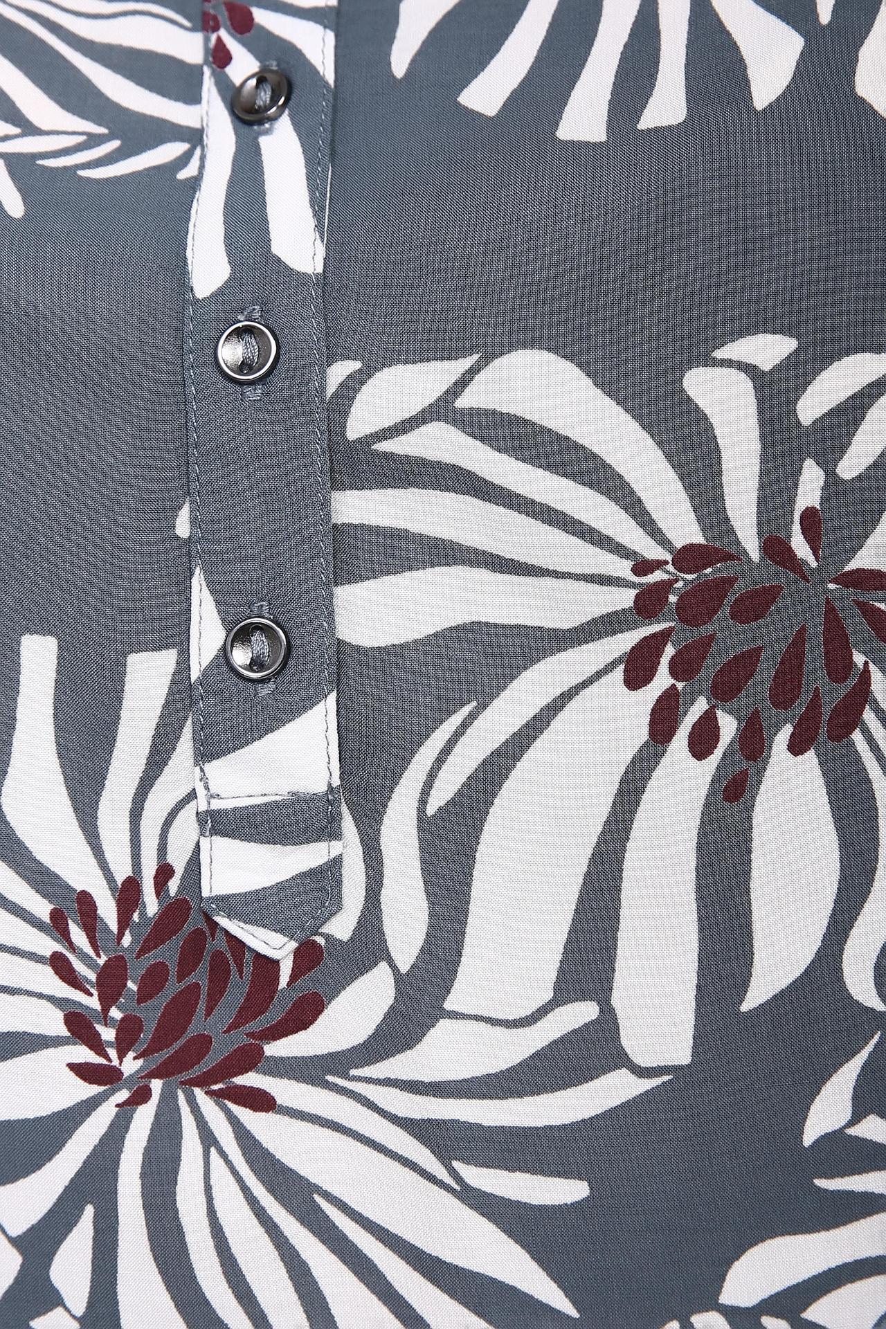 Блуза Бетти Барклай серого цвета , на котором изображены крупные цветы. Ворот данной модели выполнен круглой формы, переходящий втачную застежку в виде пуговиц. Покрой изделия прямой, свободный. Длинна у блузки 3\4. Все детали этой модели обработаны тесьмой. Блуза может гармонировать как с однотонными брюками, так и с юбками. Состав ткани дарит ощущения комфорта.