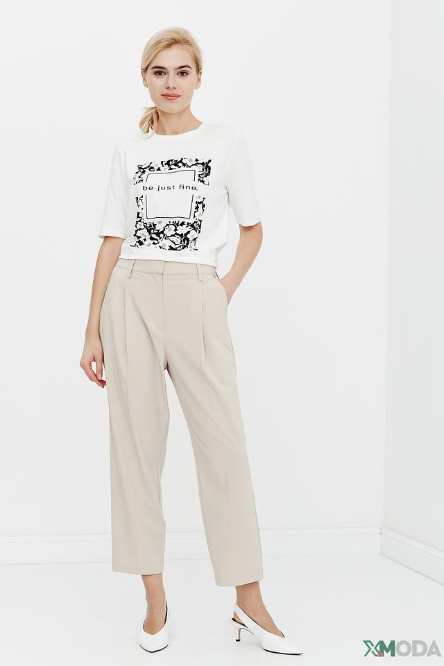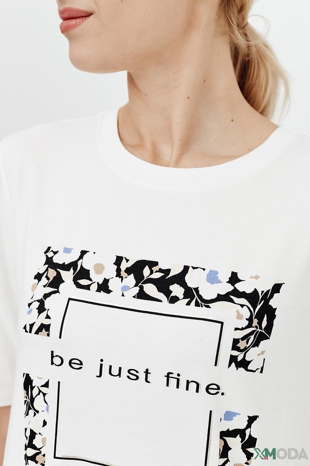 Футболка имеет прямой крой, короткий рукав и классический круглый вырез горловины. Главная особенность модели – оригинальный принт с изображением цветов и надписью "be just fine".