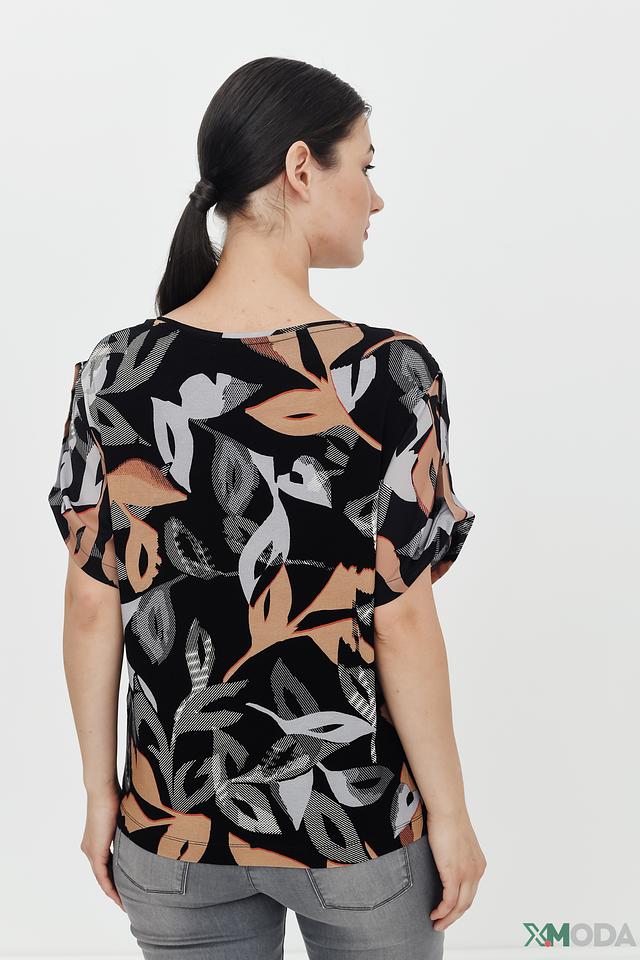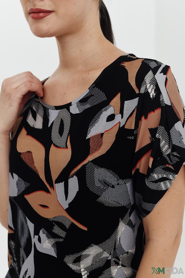 Основной цвет блузы – чёрный, который служит прекрасным фоном для яркого и необычного цветочного принта, выполненного в оттенках серого, бежевого и коричневого. Принт добавляет блузе оригинальности и делает её запоминающейся.
