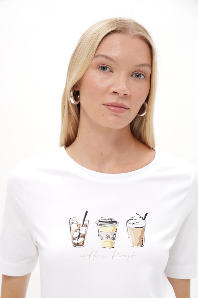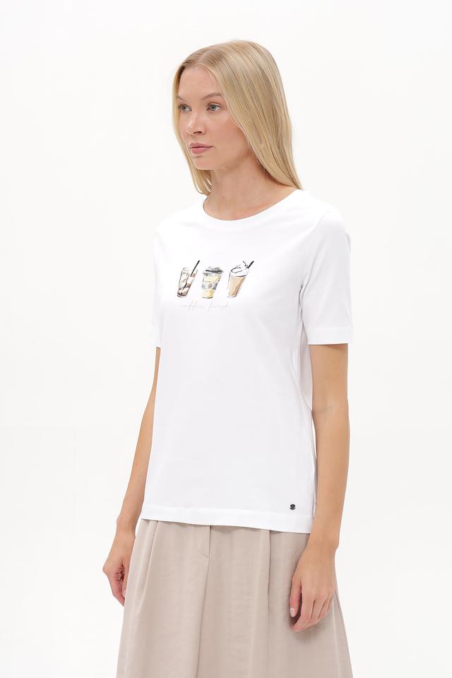 Белая футболка Betty and Co с принтом в виде кофейных напитков. Изготовлена из мягкого хлопка с добавлением эластана для комфорта. Базовая модель на каждый день. Состав: хлопок 95%, эластан 5%