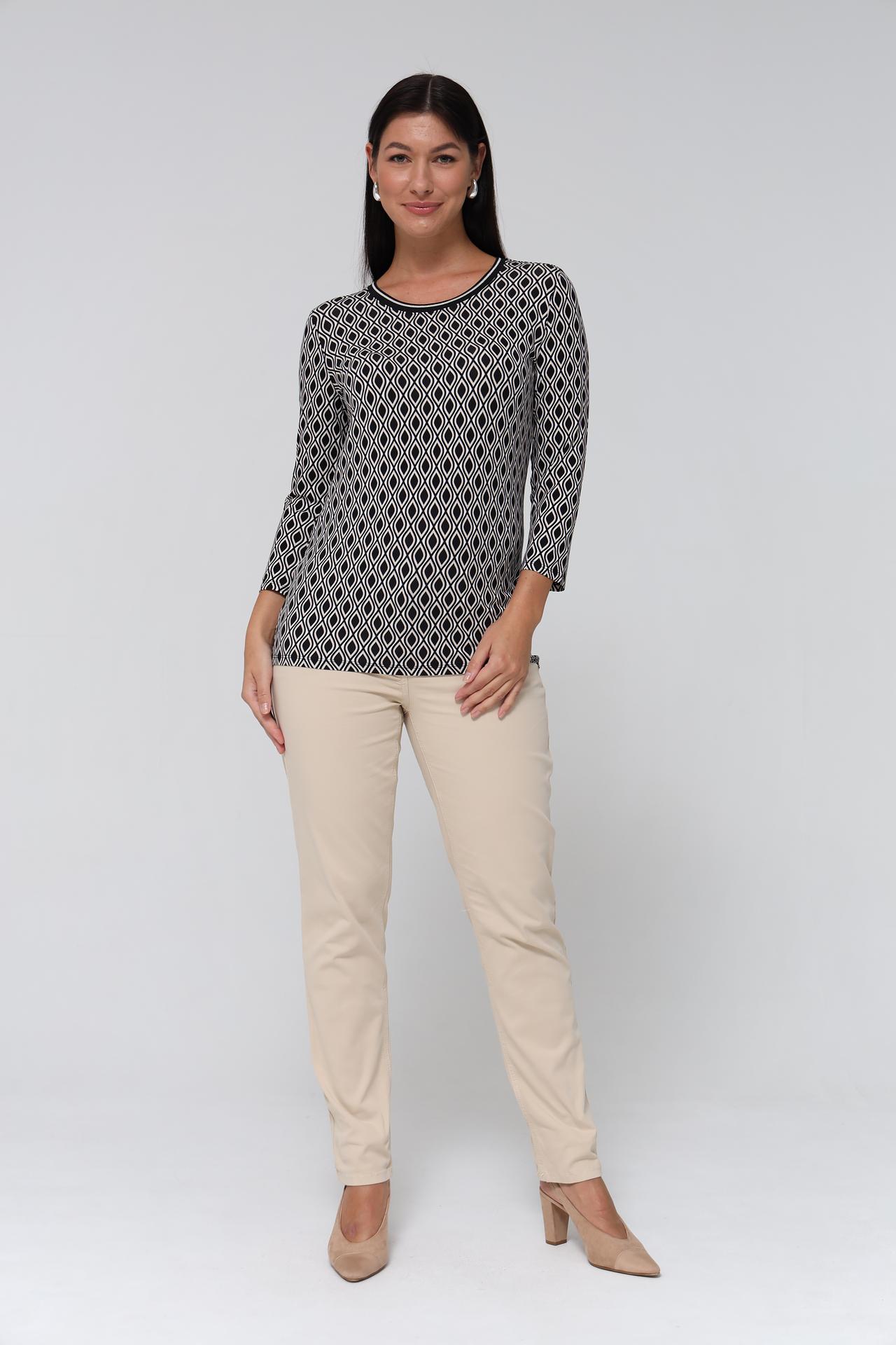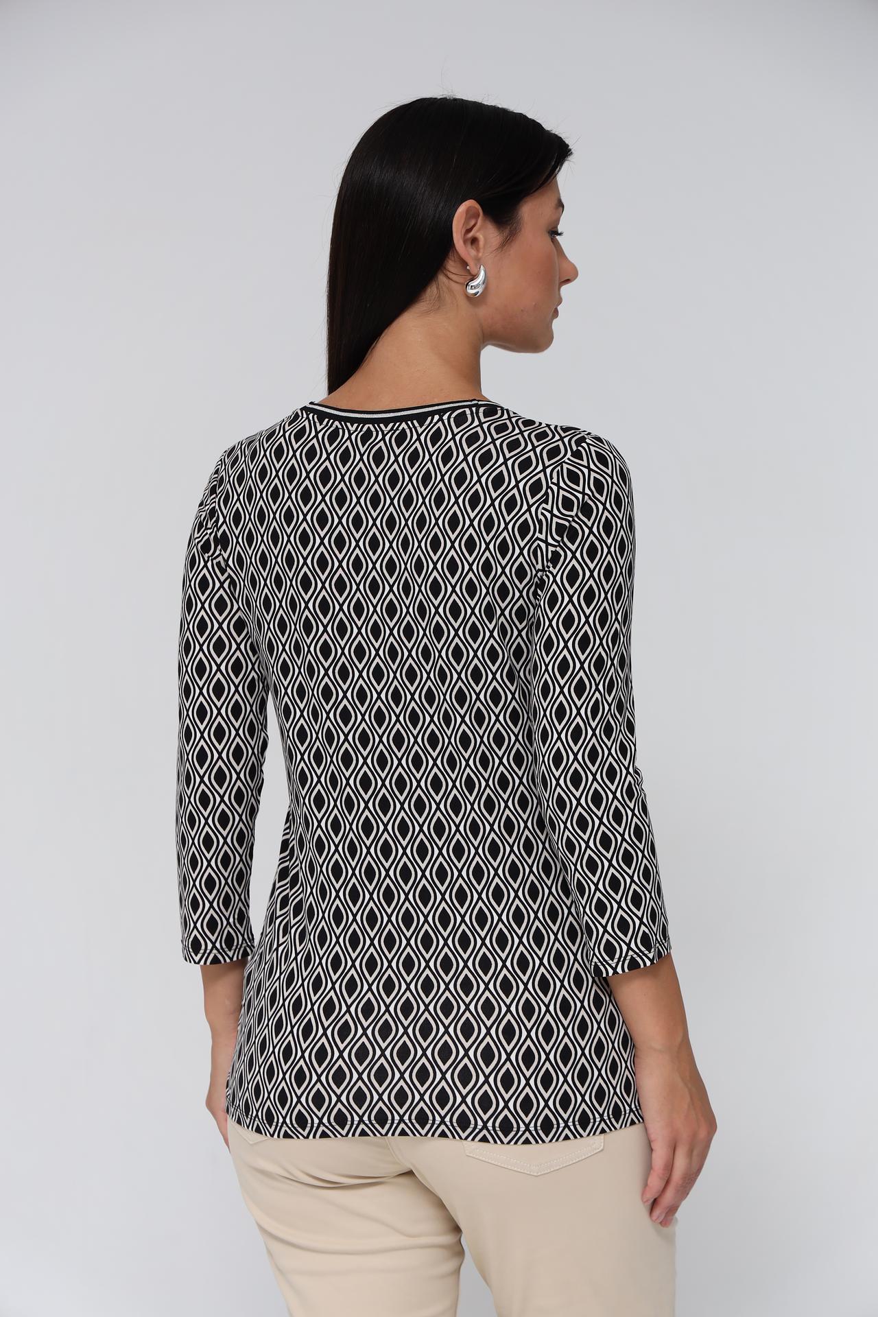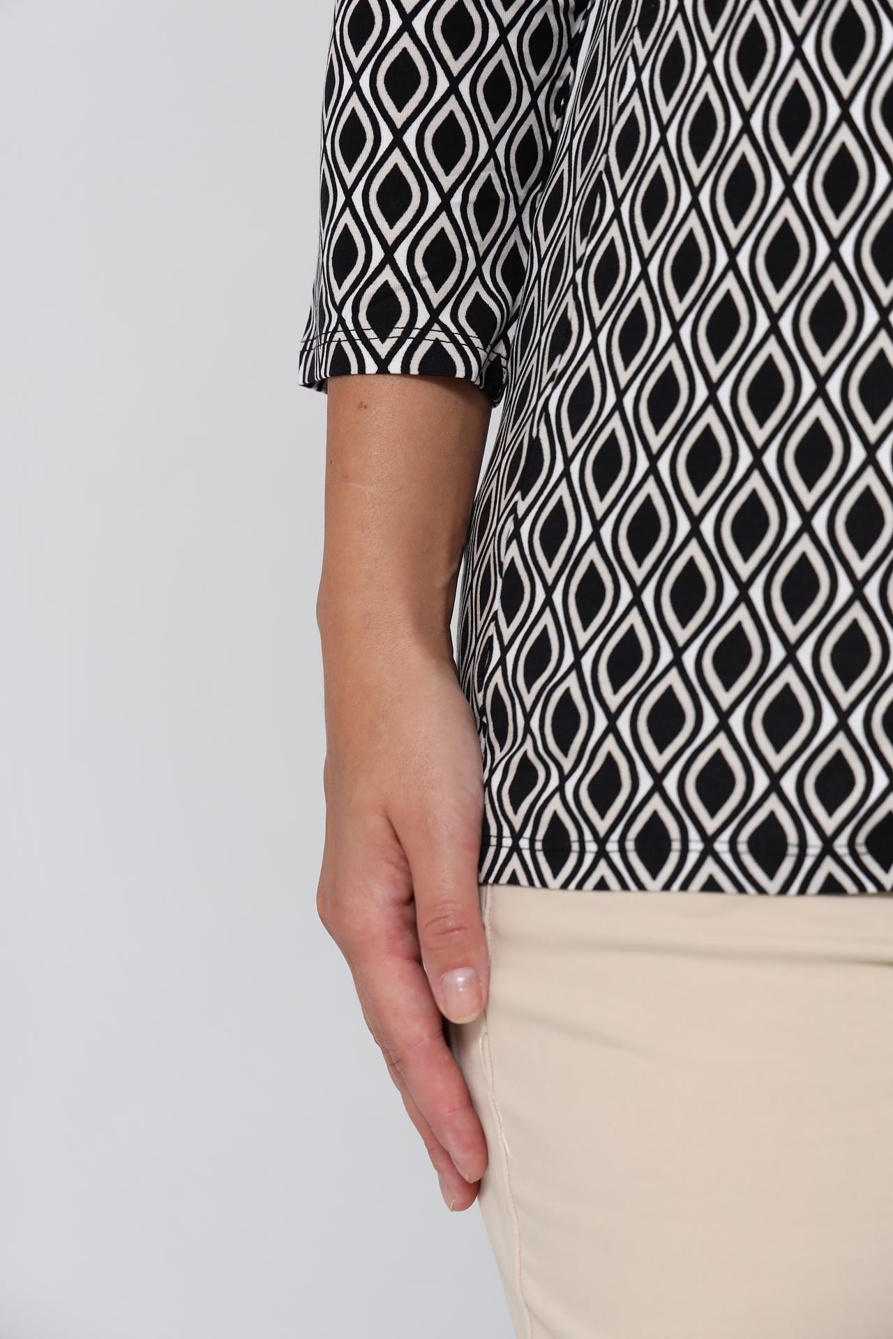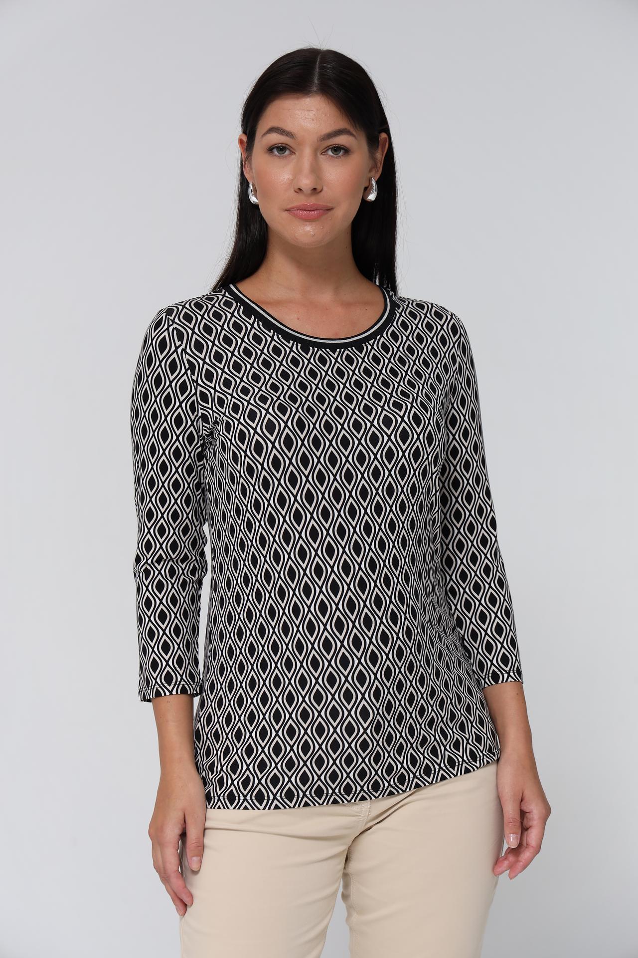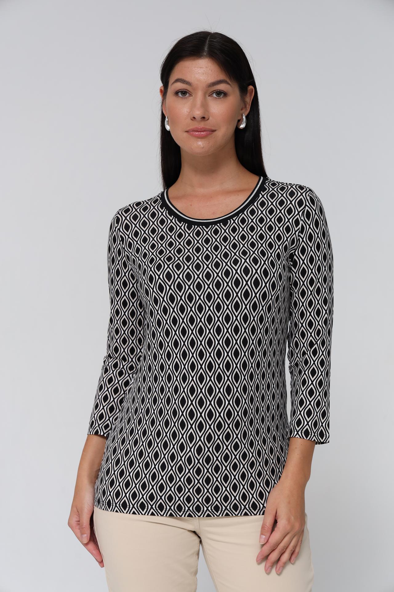 - Дизайн: Уникальный черно-белый геометрический принт в виде ромбов придает футболке выразительность и современный вид. Контрастная отделка по горловине добавляет стильный акцент, подчеркивая изысканность модели.