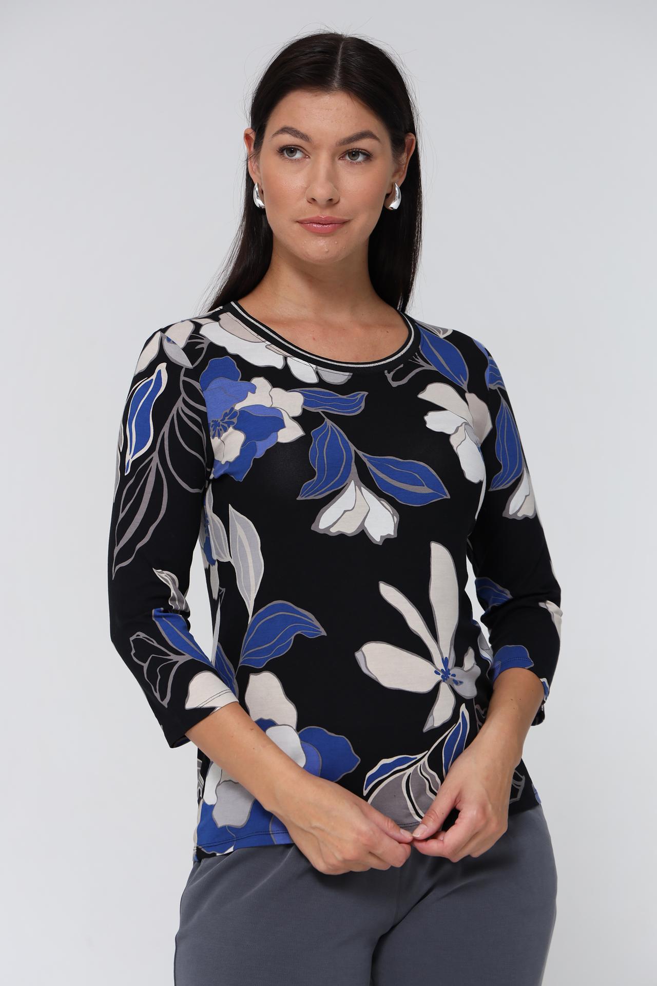 Благодаря сочетанию вискозы и эластана, ткань приятна к телу, хорошо драпируется и сохраняет форму. Яркий цветочный узор на черном фоне придает футболке особое очарование и женственность. Эта футболка отлично подойдет как для повседневных выходов, так и для более торжественных случаев.