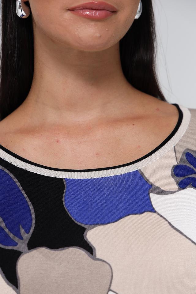 Этот стильный пуловер от Betty Barclay выполнен в чёрном цвете и украшен эффектным цветочным принтом, состоящим из оттенков синего, бежевого и серого. Модель имеет округлый вырез горловины и рукава длиной три четверти, что делает её универсальной для различных образов.
