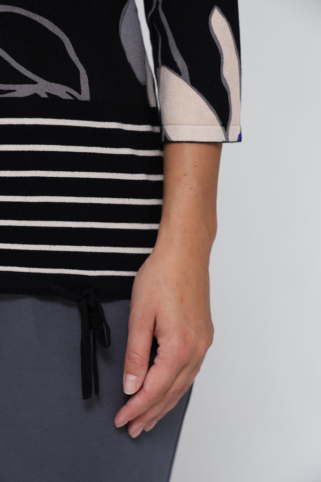 Пуловер имеет слегка приталенный силуэт, который подчеркивает фигуру. Нижняя часть изделия оформлена горизонтальными полосами, добавляющими динамики дизайну. Сочетание 80% вискозы и 20% полиамида обеспечивает мягкость, комфорт и хорошую посадку по фигуре.