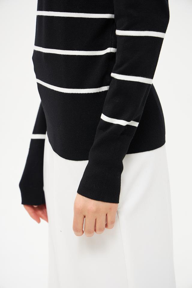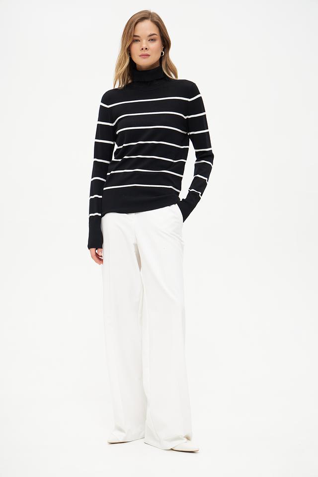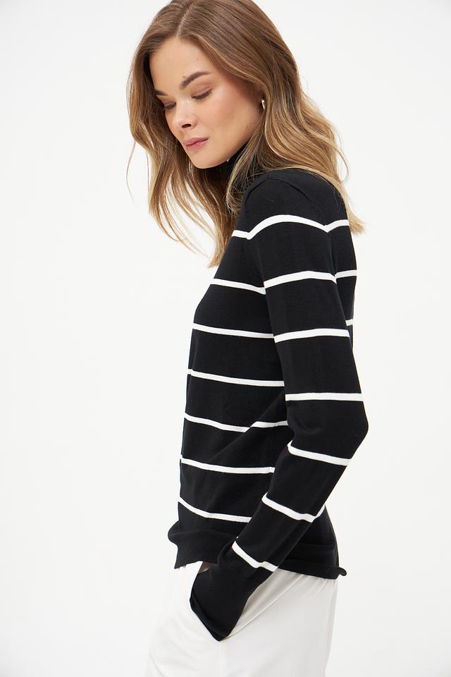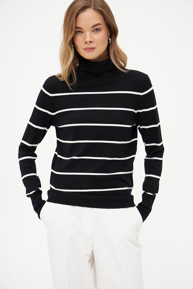 Дизайн водолазки лаконичен и элегантен. Чередование чёрных и белых полос придаёт ей динамичный вид. Высокий воротник защищает от холода и добавляет образу изысканности. Данная модель идеально сочетается с брюками, юбками и джинсами, позволяя создавать разнообразные комплекты.
