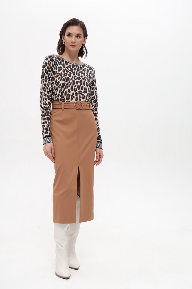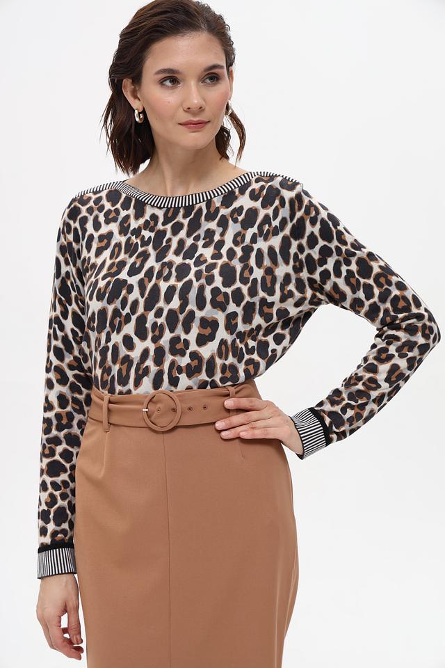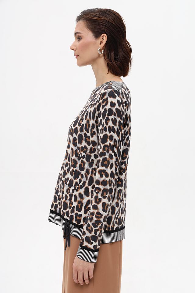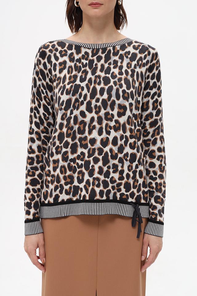 Женский пуловер Betty Barclay с леопардовым принтом и полосатой отделкой. Модель выполнена из мягкой вискозы с добавлением полиамида, что обеспечивает комфорт и приятные тактильные ощущения. Состав: вискоза 80%, полиамид 20%