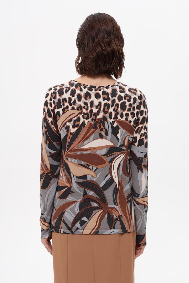Пуловер имеет свободный крой и длинные рукава. Главная особенность изделия – яркий и запоминающийся принт, сочетающий в себе элементы анималистического рисунка и абстрактных форм. Цветовая гамма включает в себя оттенки коричневого, серого и бежевого, что делает его универсальным и легко сочетаемым с другими вещами.