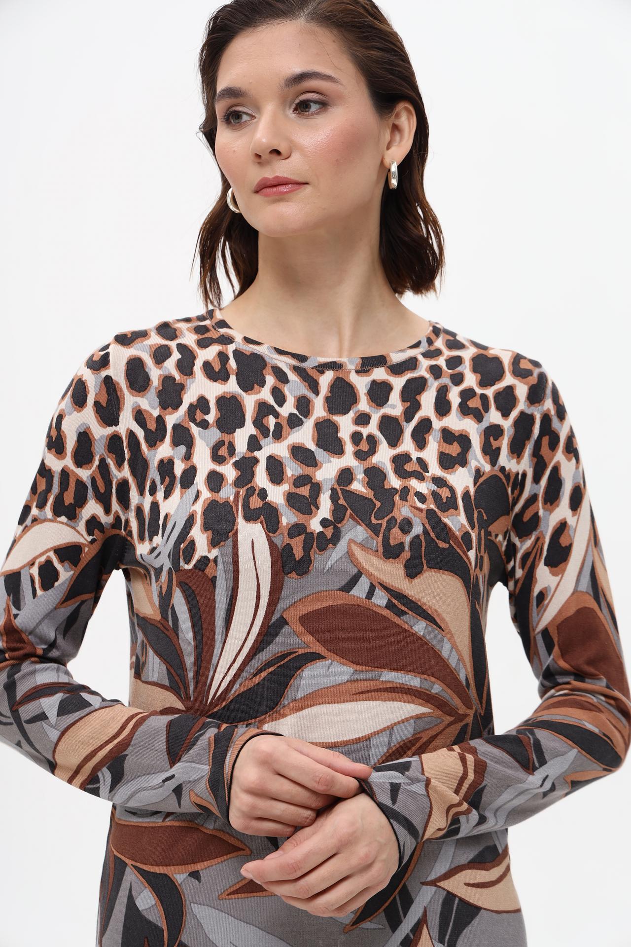 Стильный пуловер Betty Barclay станет ярким акцентом в вашем гардеробе, объединяя комфорт и модные тенденции. Изысканное сочетание анималистического леопардового принта в верхней части и абстрактного растительного узора в коричневых, бежевых и серых тонах создает уникальный, выразительный образ. Этот женский пуловер идеально подходит для создания как повседневных, так и более элегантных комплектов, обеспечивая безупречный стиль и уверенность.