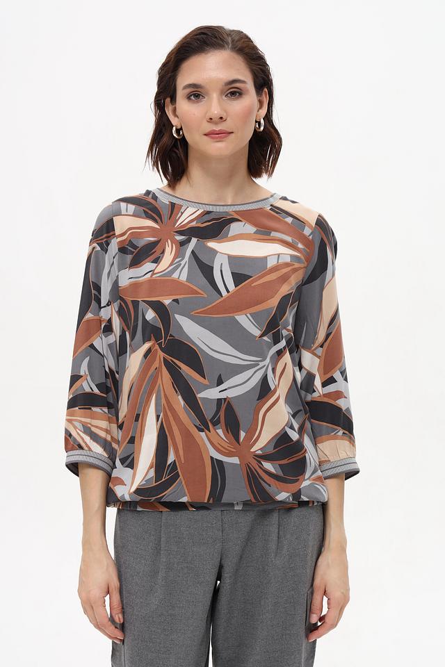 Особенностью данной модели является яркий и оригинальный принт в виде листьев, выполненный в коричневой, серой и бежевой цветовой гамме. Блуза имеет округлый вырез горловины и короткие рукава, что делает ее идеальным выбором для теплой погоды.