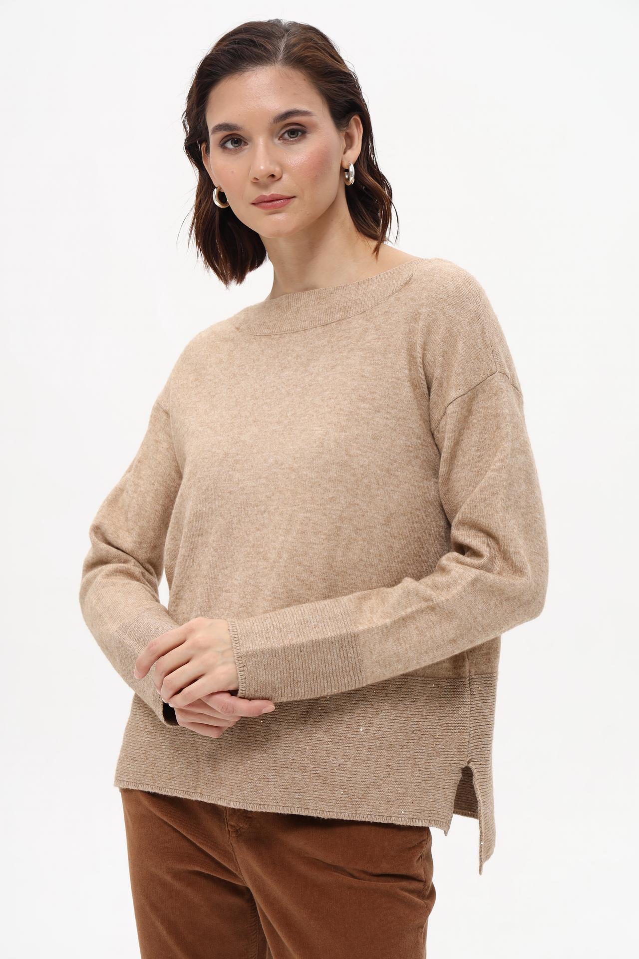 - Универсальность образа. Благодаря лаконичному дизайну и классическому бежевому цвету, этот женский пуловер легко интегрируется в гардероб, сочетаясь как с брюками, так и с юбками, создавая стильный повседневный или вечерний ансамбль.