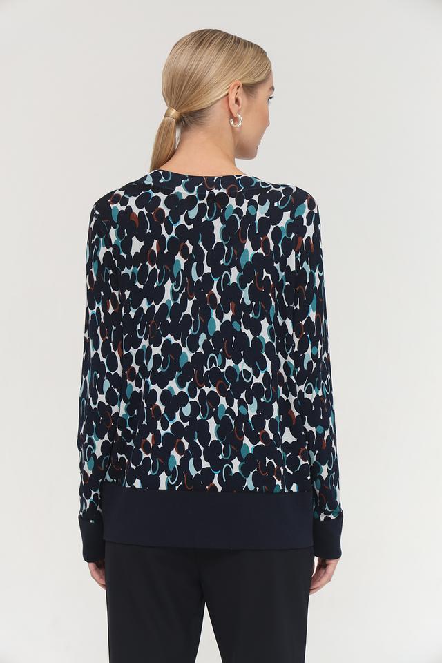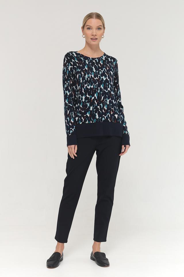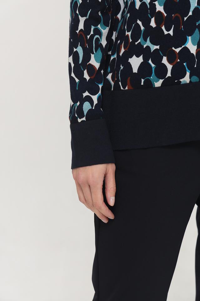 Особенностью модели является двухслойный дизайн: верхняя часть выполнена из легкой, полупрозрачной ткани с принтом, а нижняя – из плотной ткани однотонного темно-синего цвета. Рукава и нижняя кромка также выполнены из плотной ткани, что придает пуловеру аккуратный и завершенный вид.