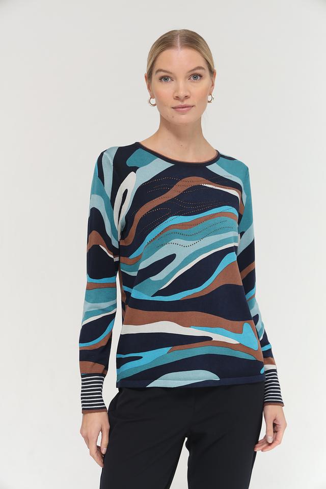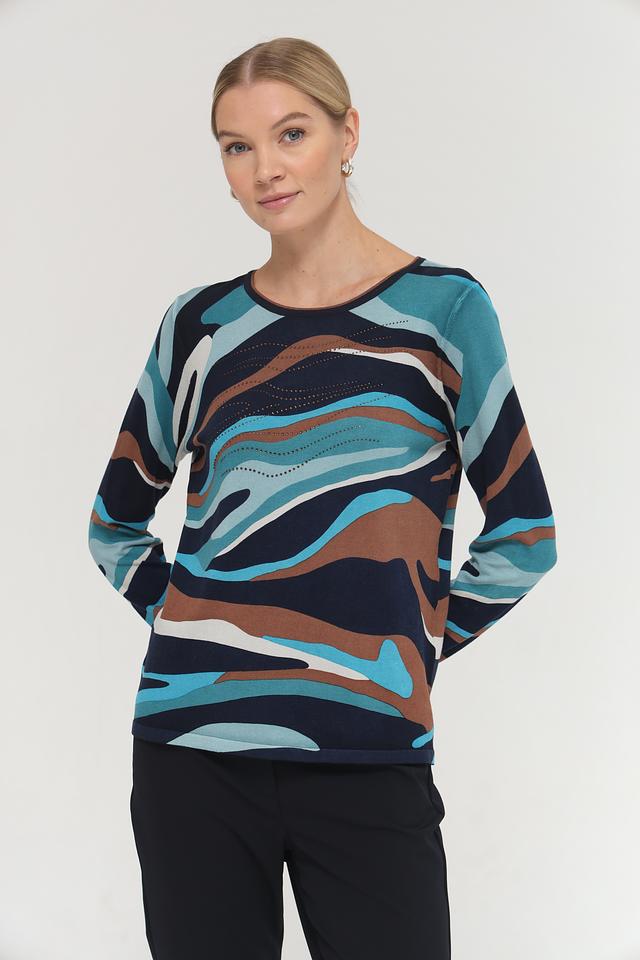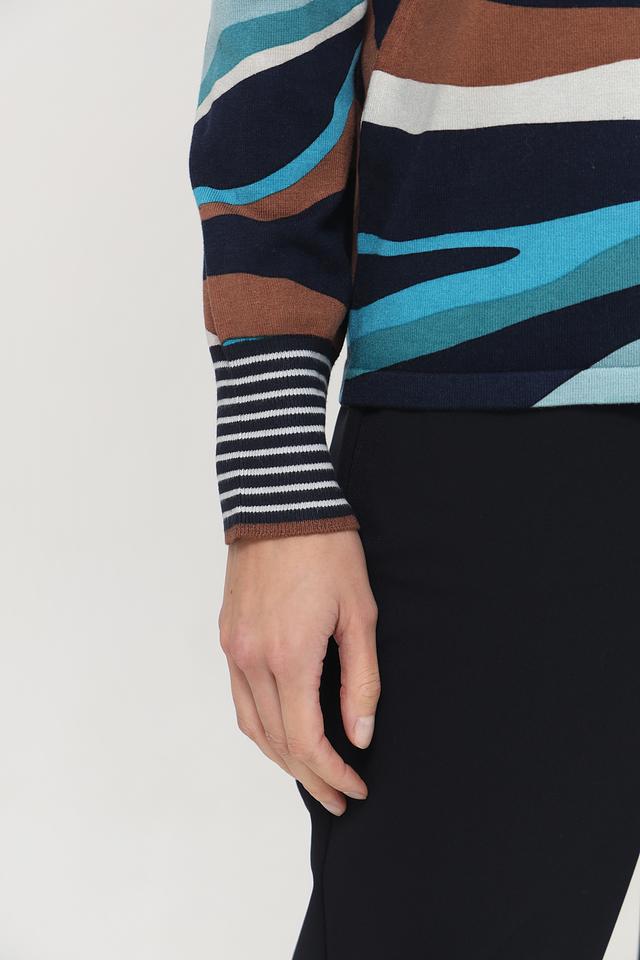 Пуловер имеет свободный крой и круглый вырез горловины. Его отличает яркий и необычный абстрактный принт, сочетающий в себе оттенки бирюзового, коричневого и тёмно-синего. Манжеты рукавов выполнены в полоску.