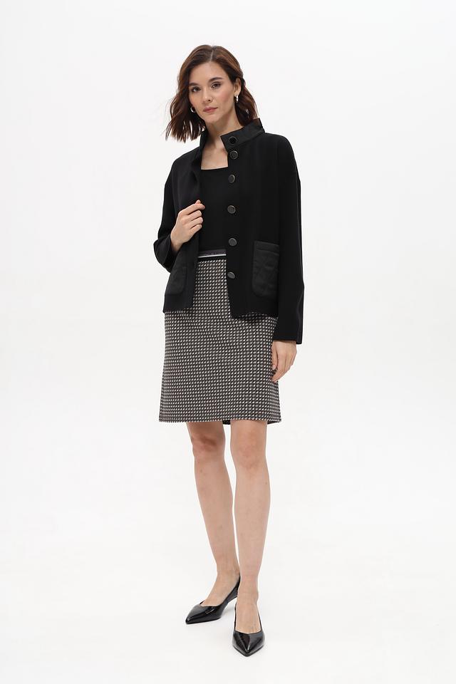 Юбка имеет классическую прямую форму и длину до колена. Особенностью модели является стильный геометрический принт в чёрно-белой гамме, который придаёт ей элегантный и современный вид. Эластичный пояс обеспечивает комфортную посадку по фигуре.