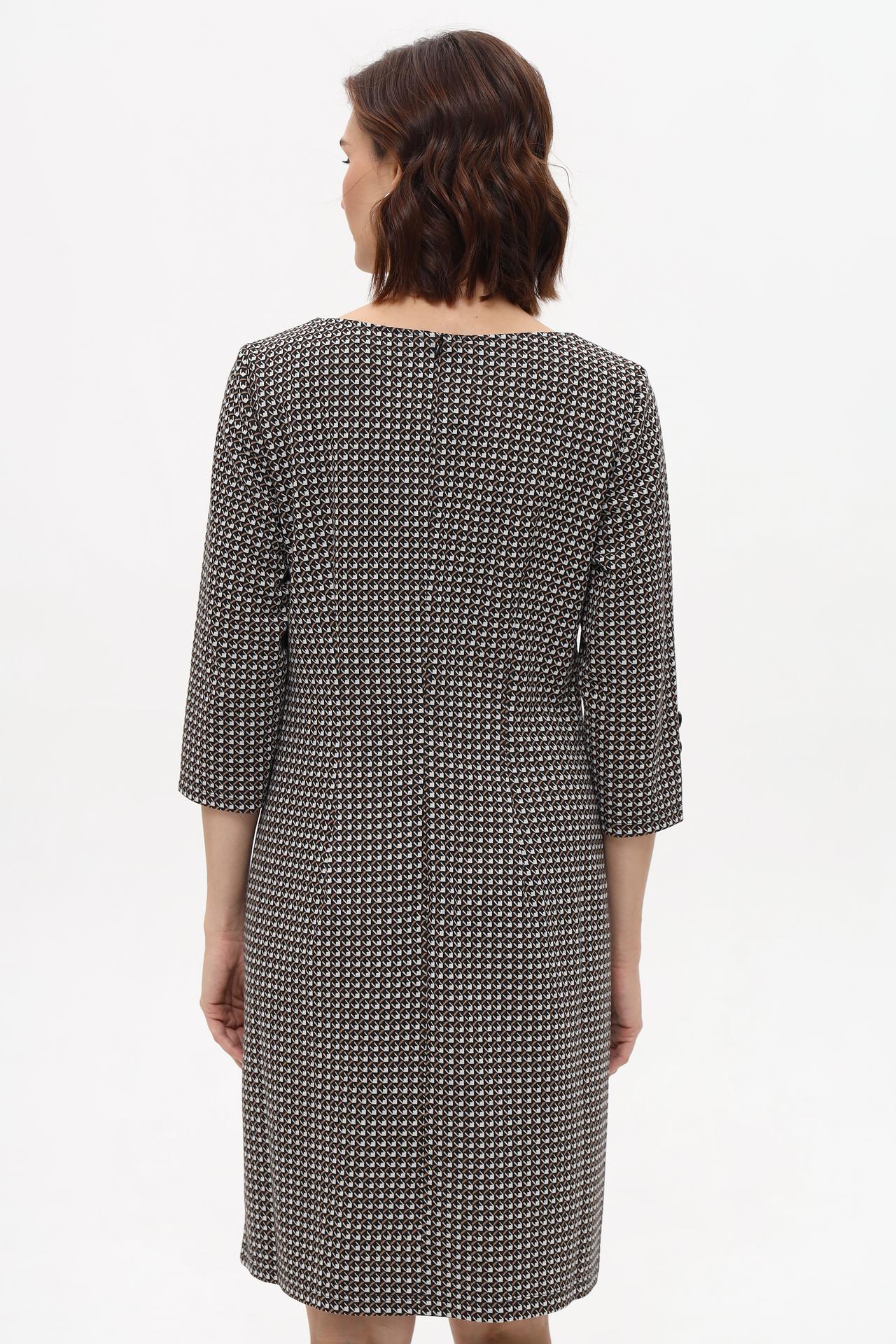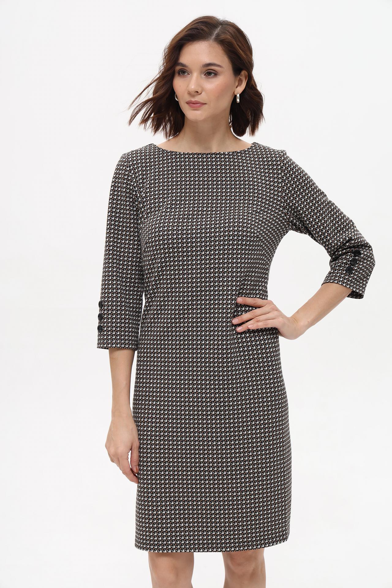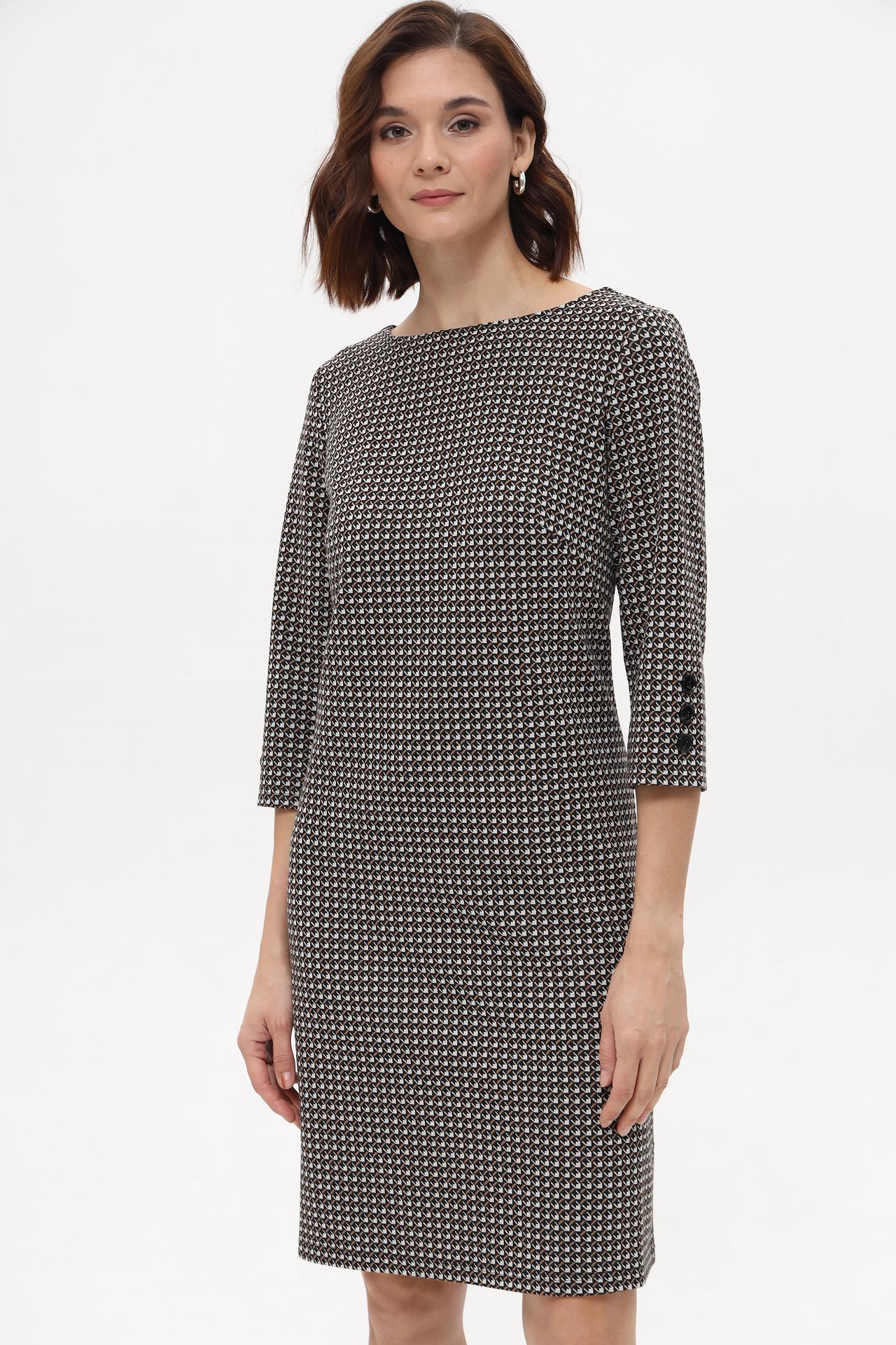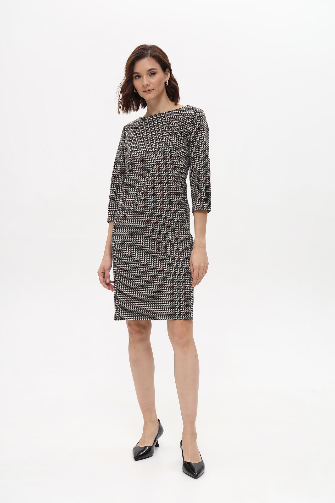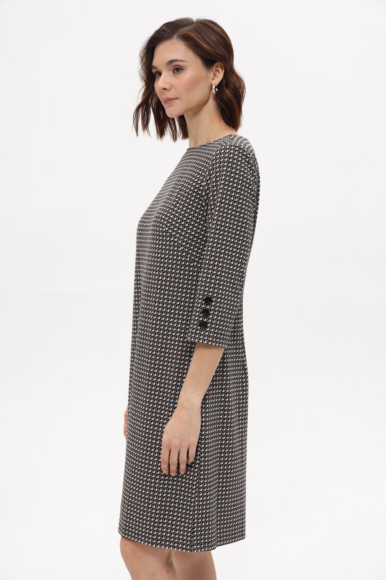 - Дизайн и крой: Платье прямого силуэта с длиной до колена и элегантным вырезом-лодочкой. Рукав 3/4 с декоративными пуговицами на манжетах. Геометрический узор мелкого масштаба выглядит современно и неброско.