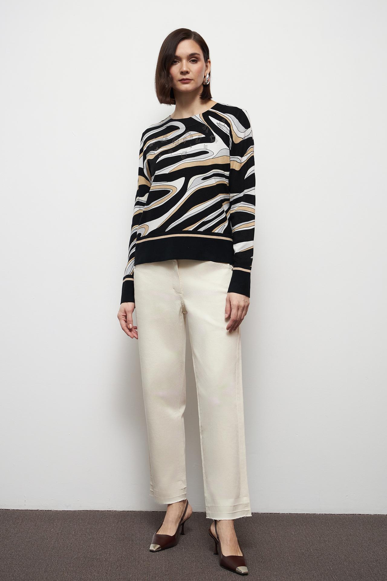 - Яркий Дизайн: Пуловер украшен динамичным абстрактным орнаментом и мерцающими стразами, которые выделяют его из общей массы и подчеркивают индивидуальность.