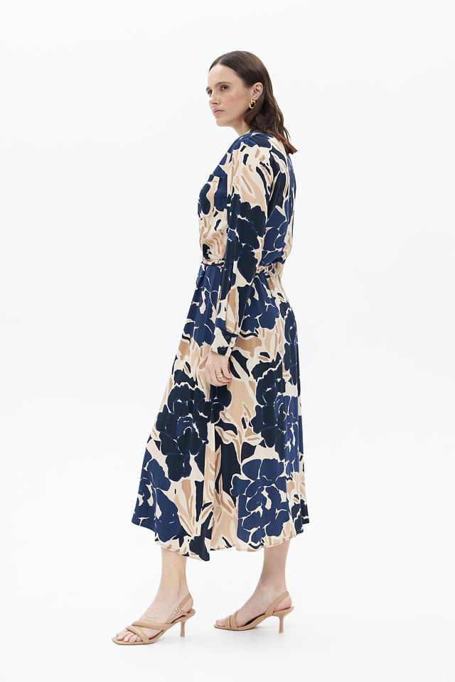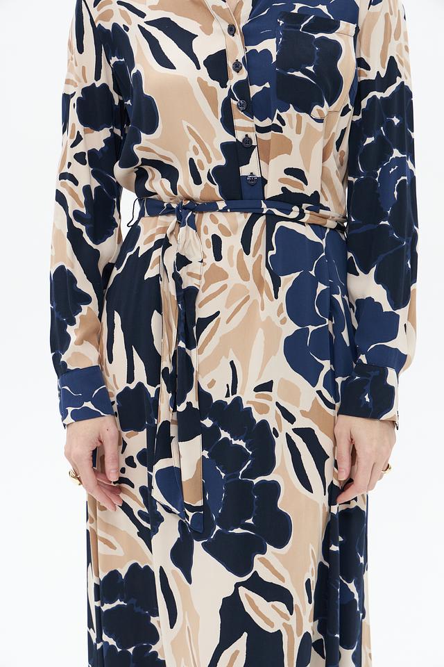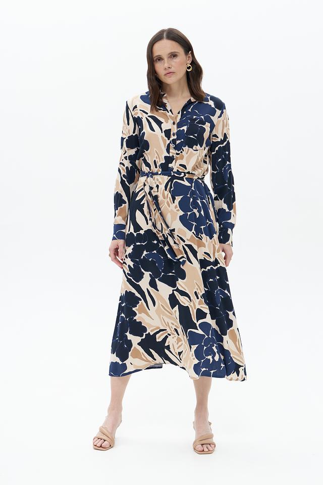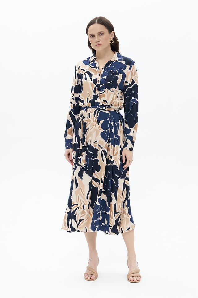 Платье отличается оригинальным цветочным принтом, сочетающим в себе бежевые и насыщенные синие оттенки. Застежка на пуговицах в верхней части платья и пояс позволяют регулировать посадку по фигуре.