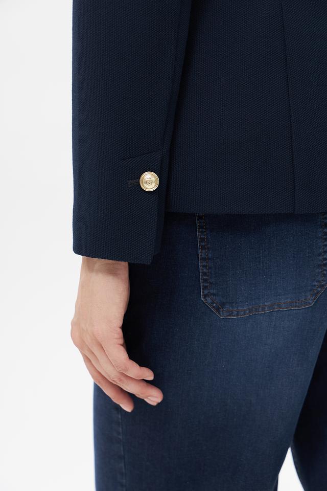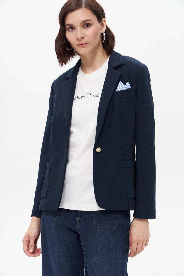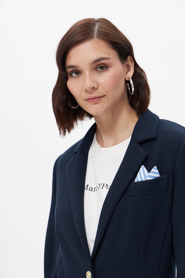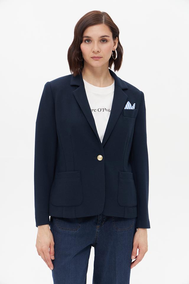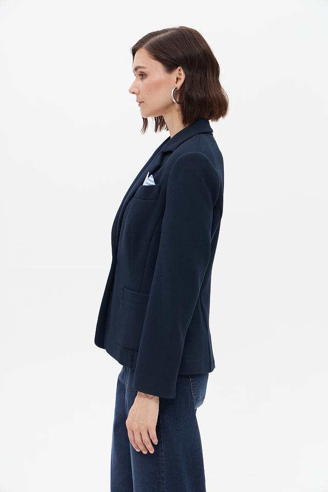 Жакет имеет приталенный силуэт, который подчеркивает фигуру, и однобортную застежку на одну золотистую пуговицу. Отложной воротник и прорезные карпады добавляют классические нотки. На левой стороне груди предусмотрен карман для нагрудного платка.