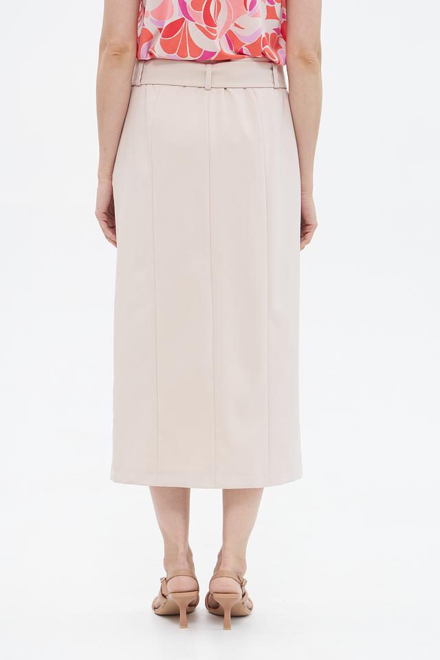 Юбка имеет классическую длину миди и прямой крой, который подчеркивает достоинства фигуры. Оригинальный элемент дизайна – разрез спереди, который добавляет юбке динамичности и современности.