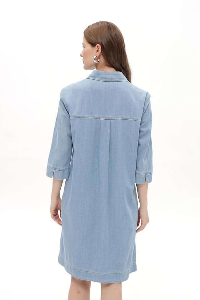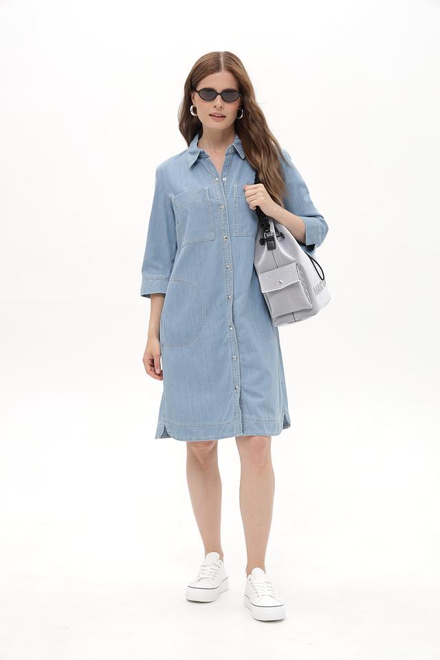 Модель застегивается на ряд пуговиц по всей длине платья, что позволяет регулировать степень прилегания. На передней части расположены два функциональных накладных кармана. Классический воротник рубашка добавляет образу аккуратность.
