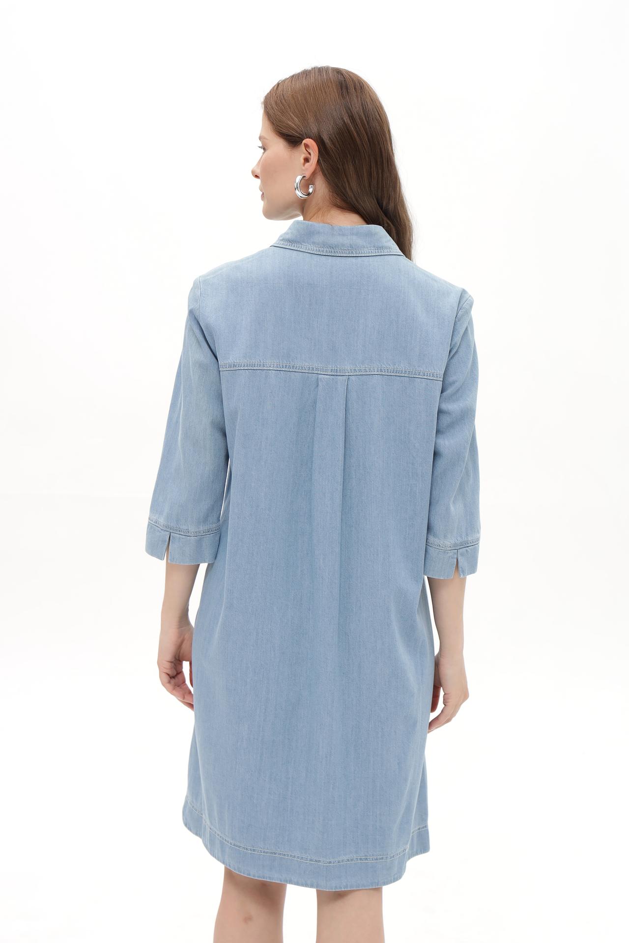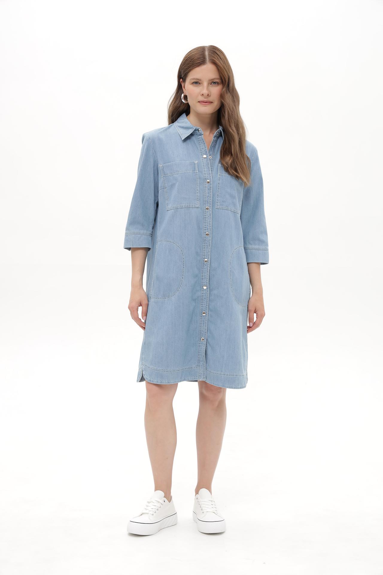 Универсальный крой с длиной до колена, рукавами 3/4 и отложным воротником делает модель практичной и легко комбинируемой. Функциональные детали, такие как нагрудные и боковые накладные карманы, а также застежка на серебристые пуговицы по всей длине, подчеркивают современный и непринужденный стиль. Это женское платье станет незаменимой основой вашего летнего гардероба.