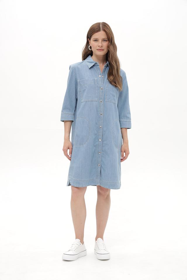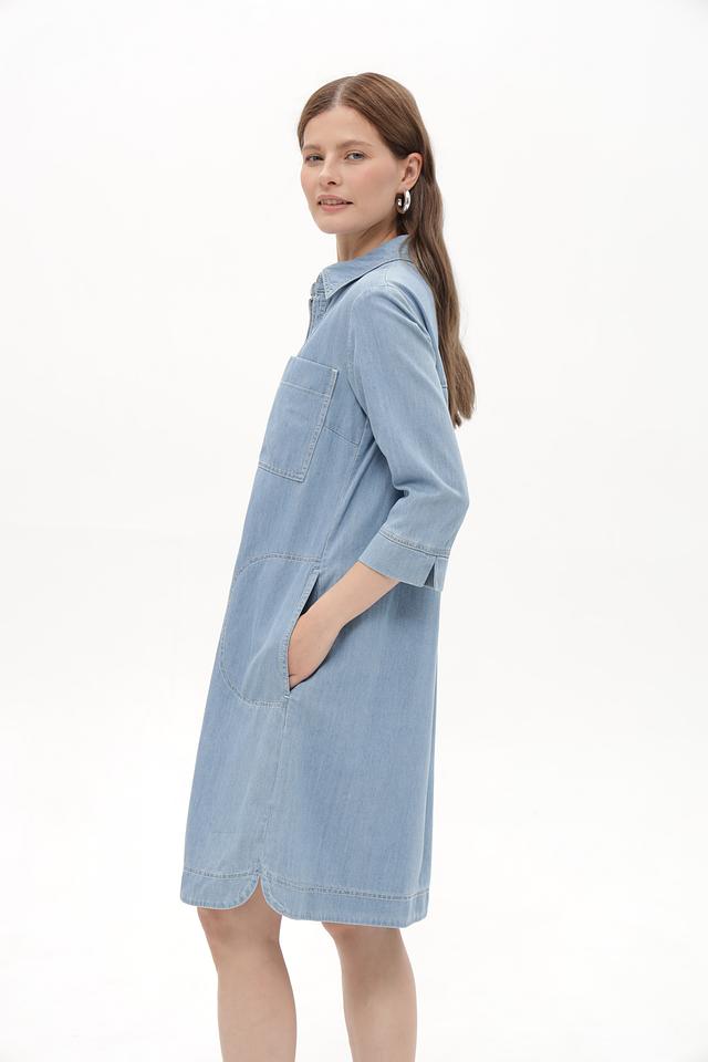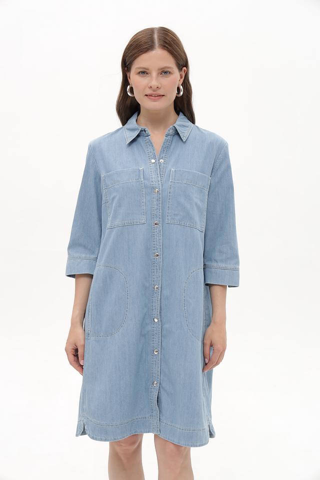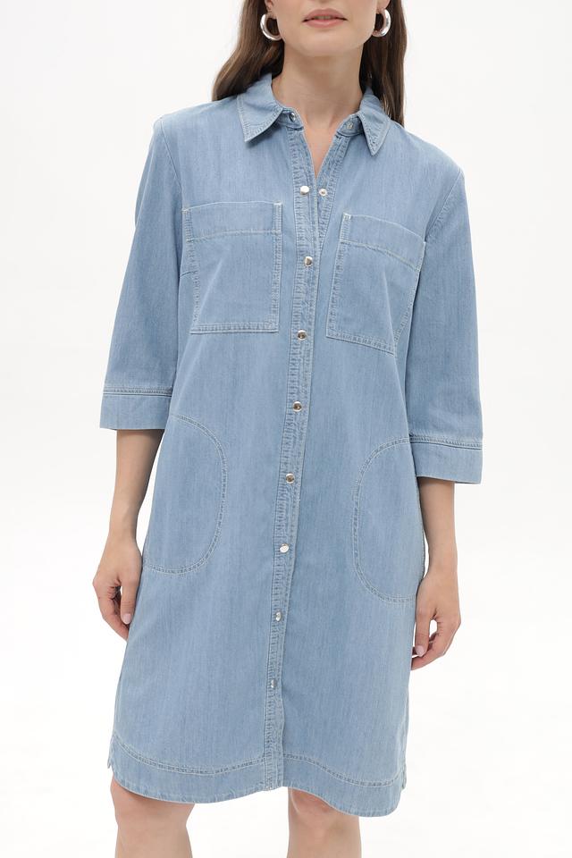 Голубое платье рубашка от Betty Barclay из хлопка с добавлением лиоцела и модала. Удобный крой, застежка на пуговицы и накладные карманы. Состав: хлопок 50%, лиоцел 40%, модал 10%