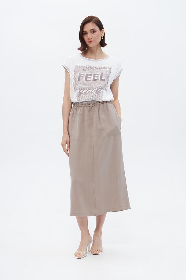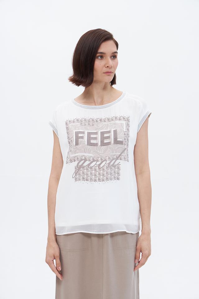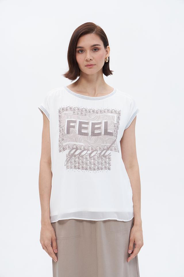 Белая блузка Betty Barclay с оригинальным принтом "FEEL good" станет стильным дополнением к вашему гардеробу. Модель свободного кроя с короткими рукавами выполнена из лёгкой вискозы с добавлением эластана. Состав: вискоза 95%, эластан 5%