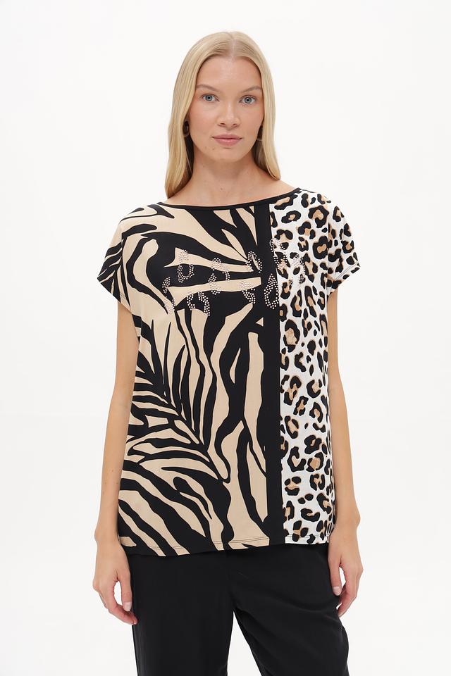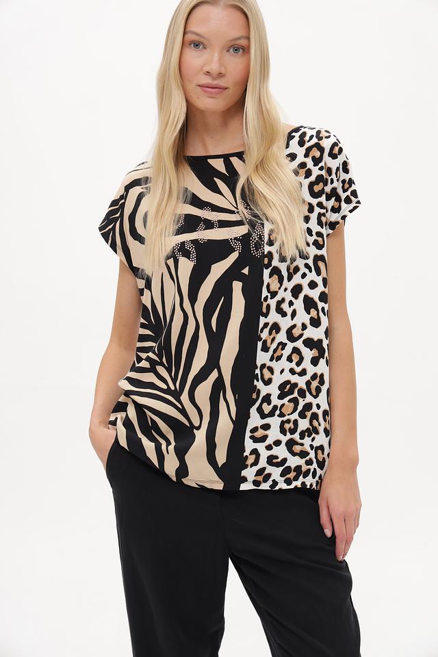 Блузка имеет свободный крой и короткие рукава, что делает ее идеальным выбором для теплой погоды. Особенностью модели является оригинальный принт, сочетающий в себе элементы зебры и леопарда, выполненный в бежевых и черных тонах.
