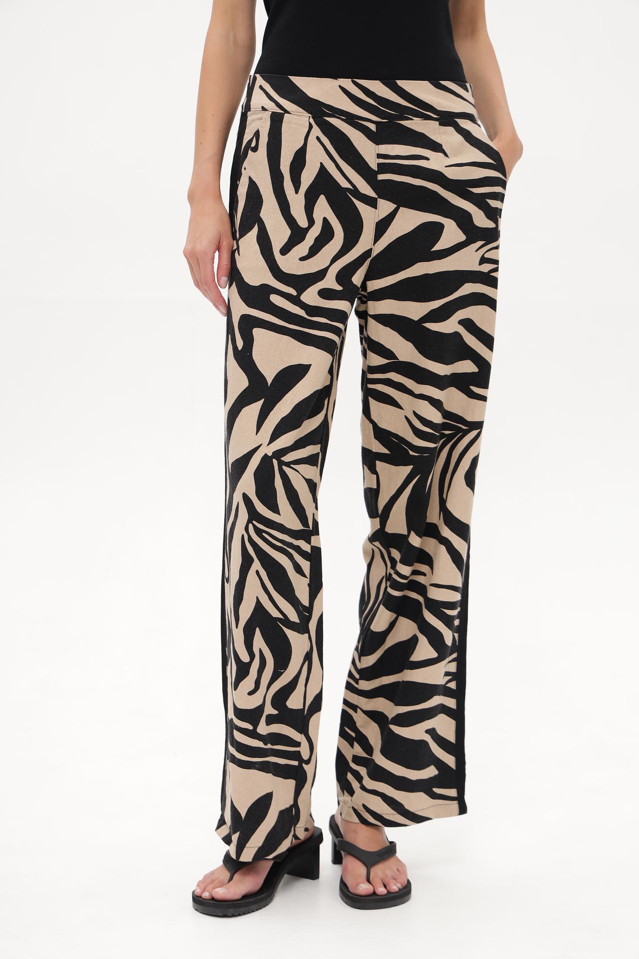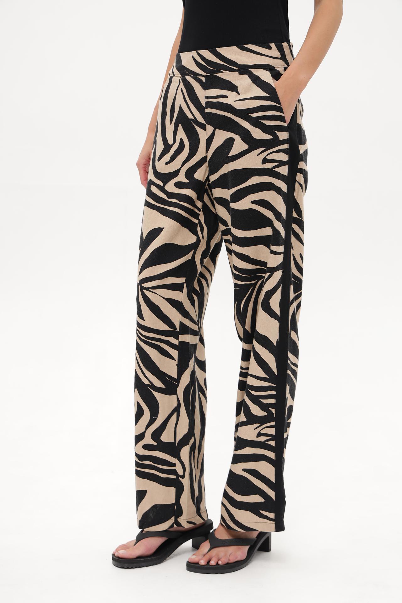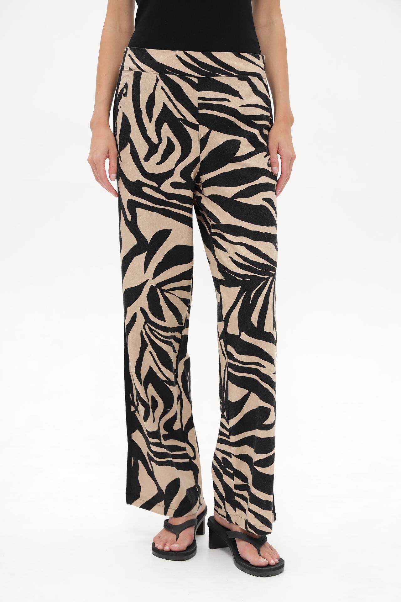 - Дизайн: Широкие брюки прямого кроя с эффектным принтом «зебра» в черном и бежевом цветах. Контрастная черная полоса вдоль бокового шва визуально стройнит и добавляет динамики.