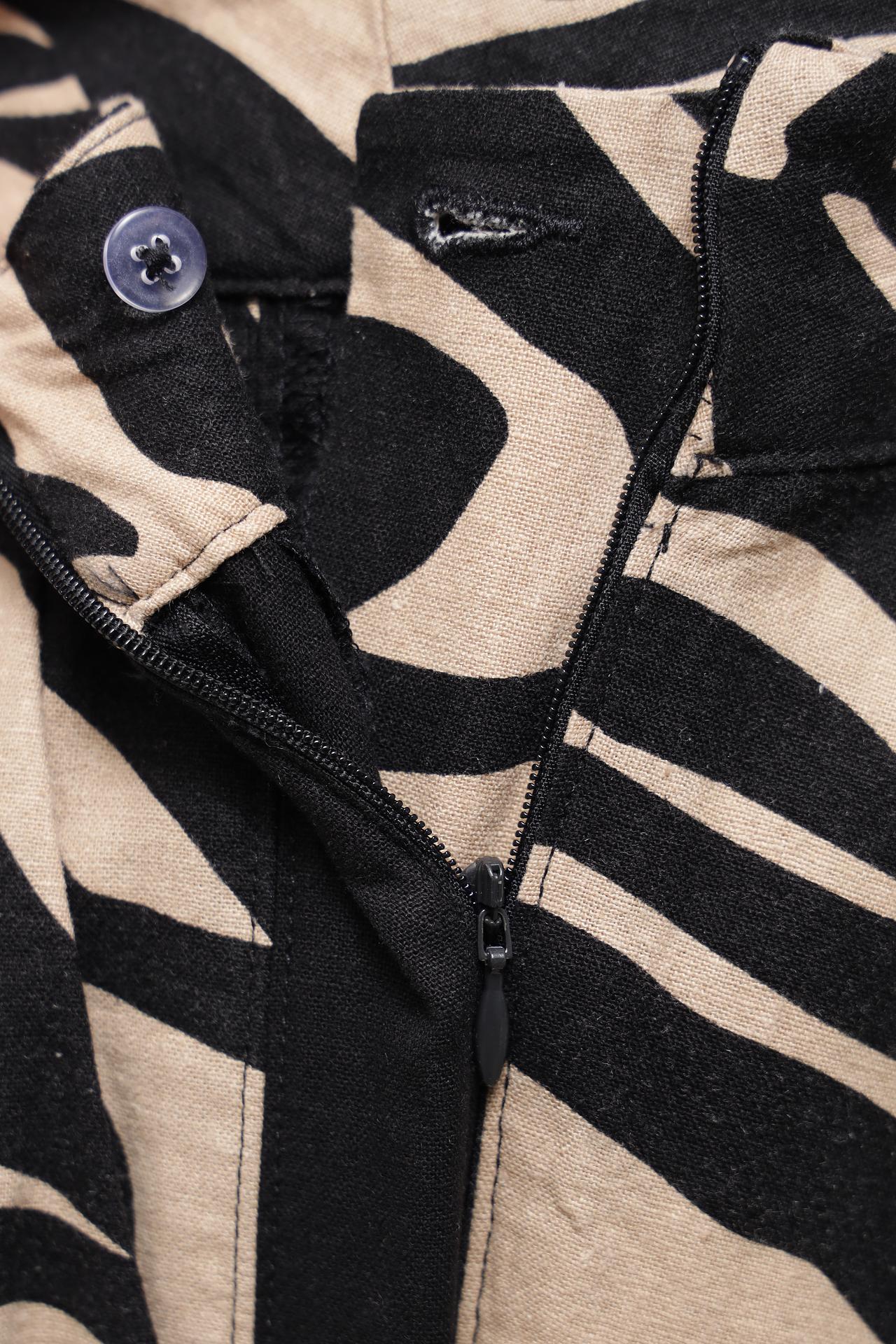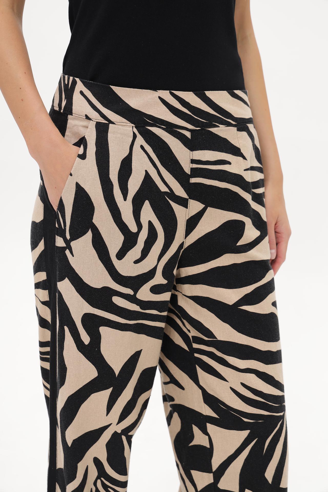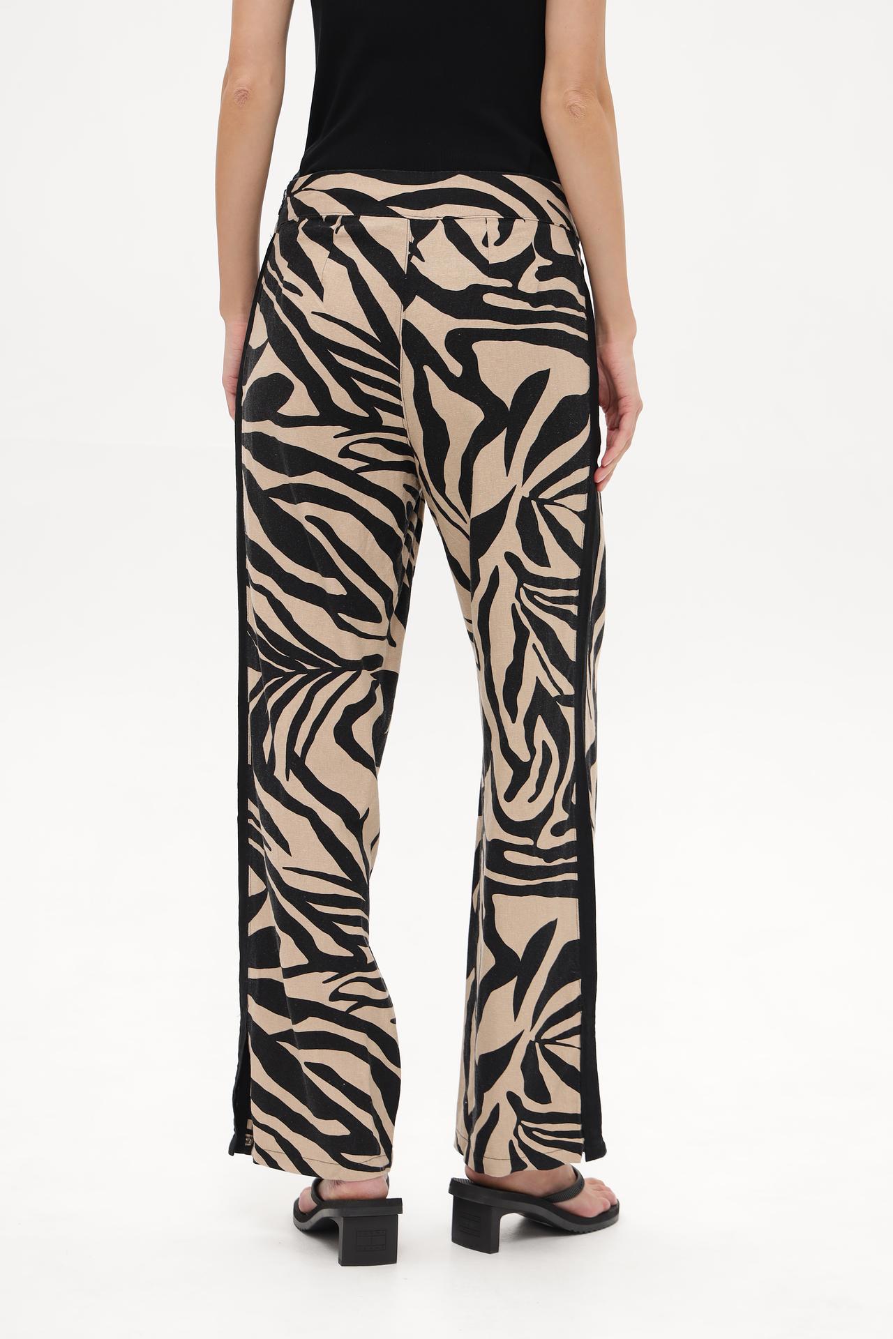 - Дизайн: Широкие брюки прямого кроя с эффектным принтом «зебра» в черном и бежевом цветах. Контрастная черная полоса вдоль бокового шва визуально стройнит и добавляет динамики.