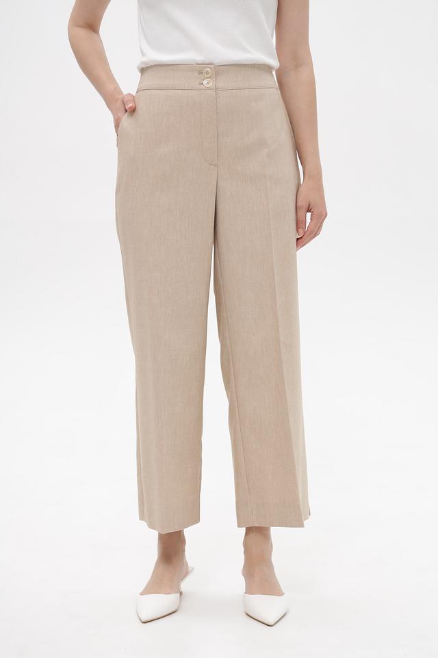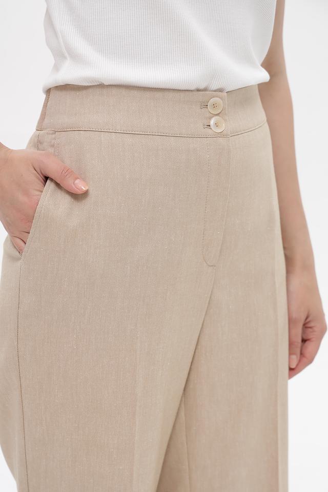Брюки имеют классический крой с застежкой на две пуговицы и боковыми карманами. Состав ткани включает полиэстер, хлопок, вискозу, лен и эластан, что обеспечивает комфорт в носке, хорошую посадку и устойчивость к сминанию.