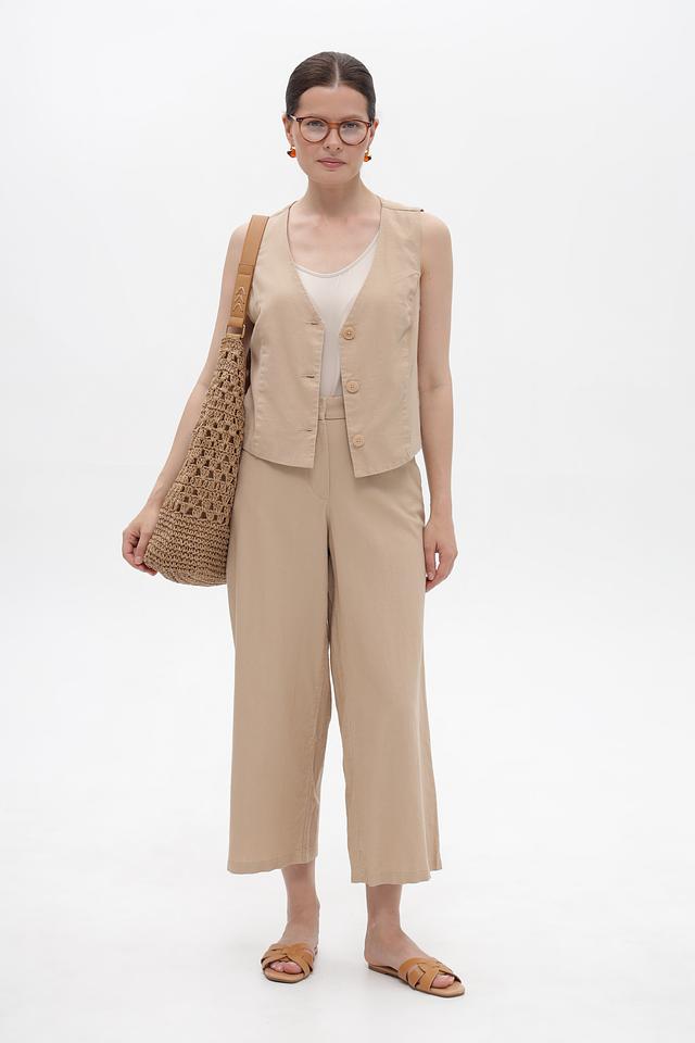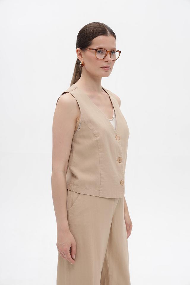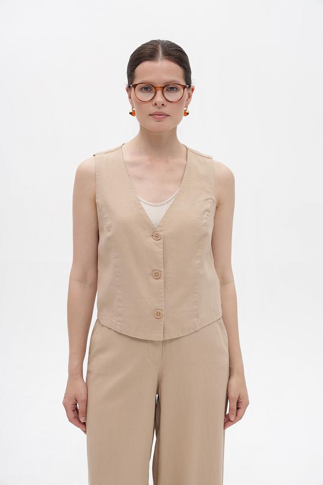Жилет от Betty Barclay выполнен из смесовой ткани, сочетающей в себе натуральный лен и вискозу. Преобладающий бежевый оттенок делает его универсальным дополнением к любому образу.