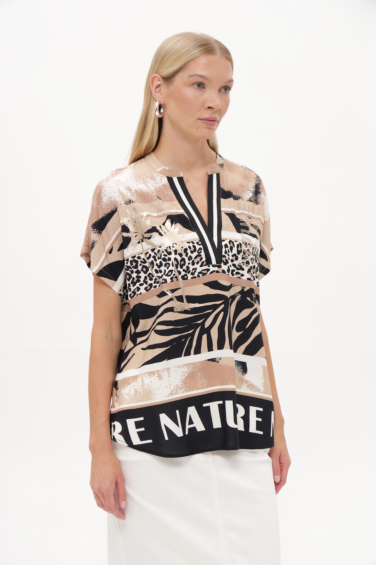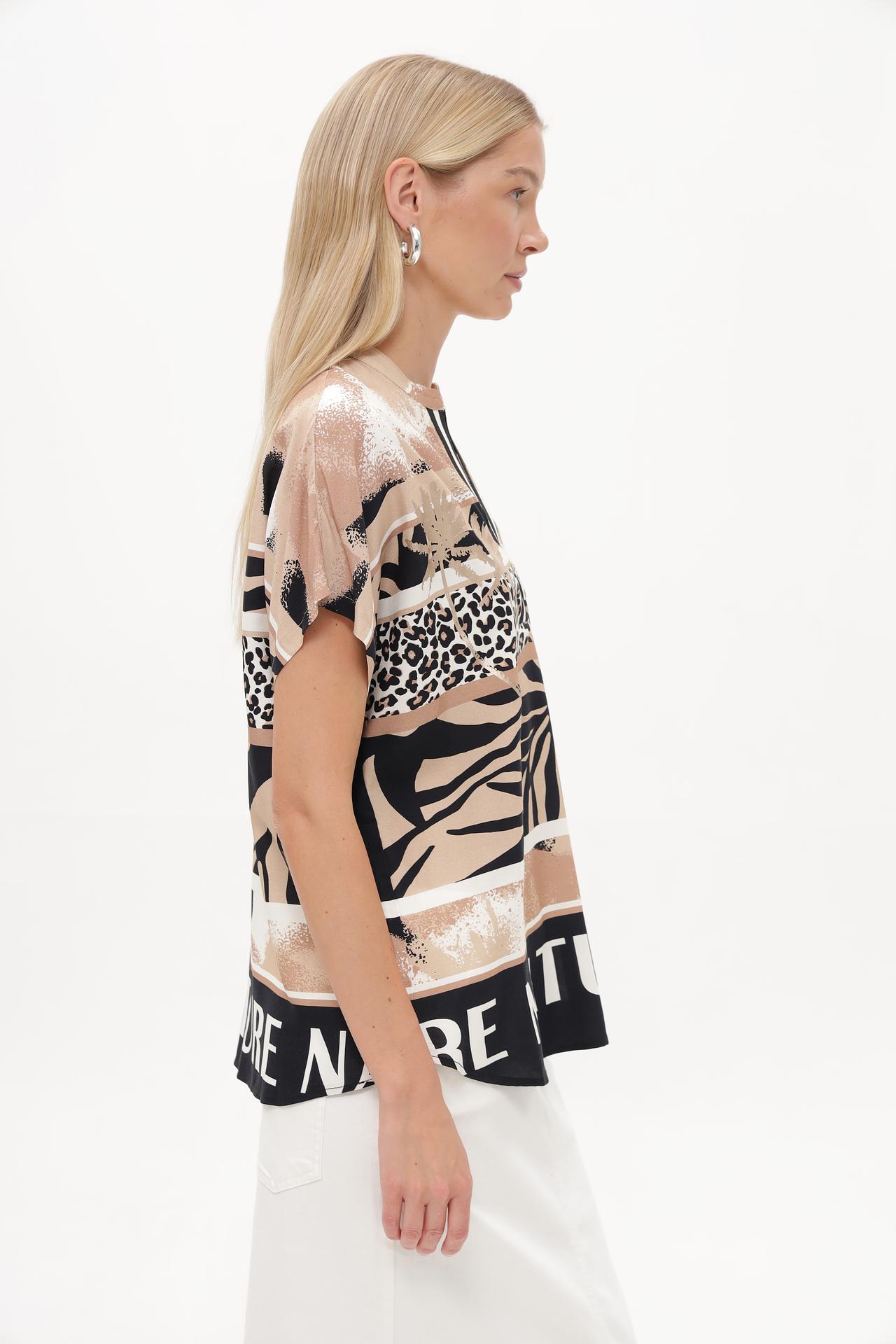 - Дизайн и принт. Модель отличает оригинальный многоцветный принт, включающий полосы, леопардовый и зебровый узоры, а также декоративную надпись. Это придает блузке современный и выразительный вид.
