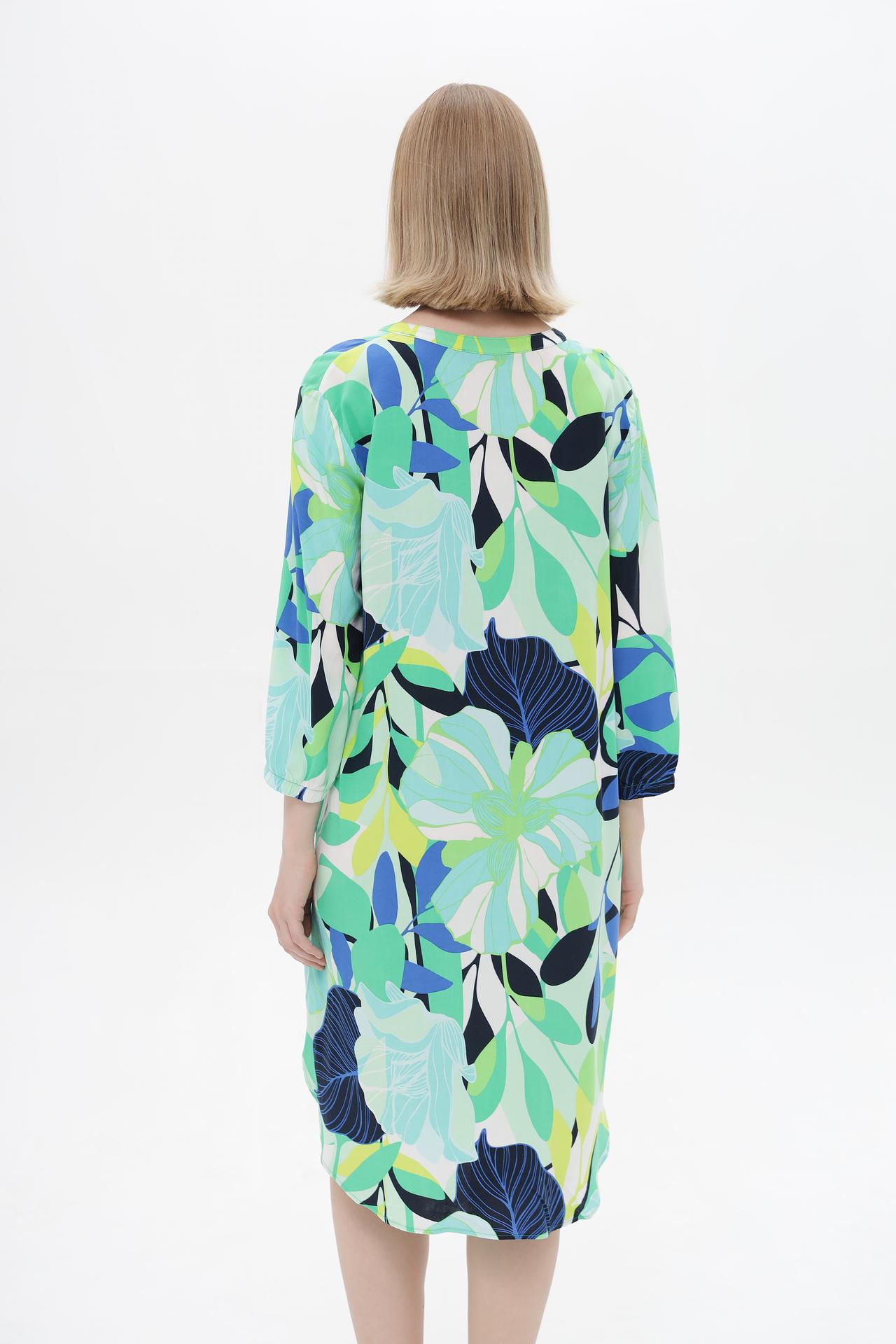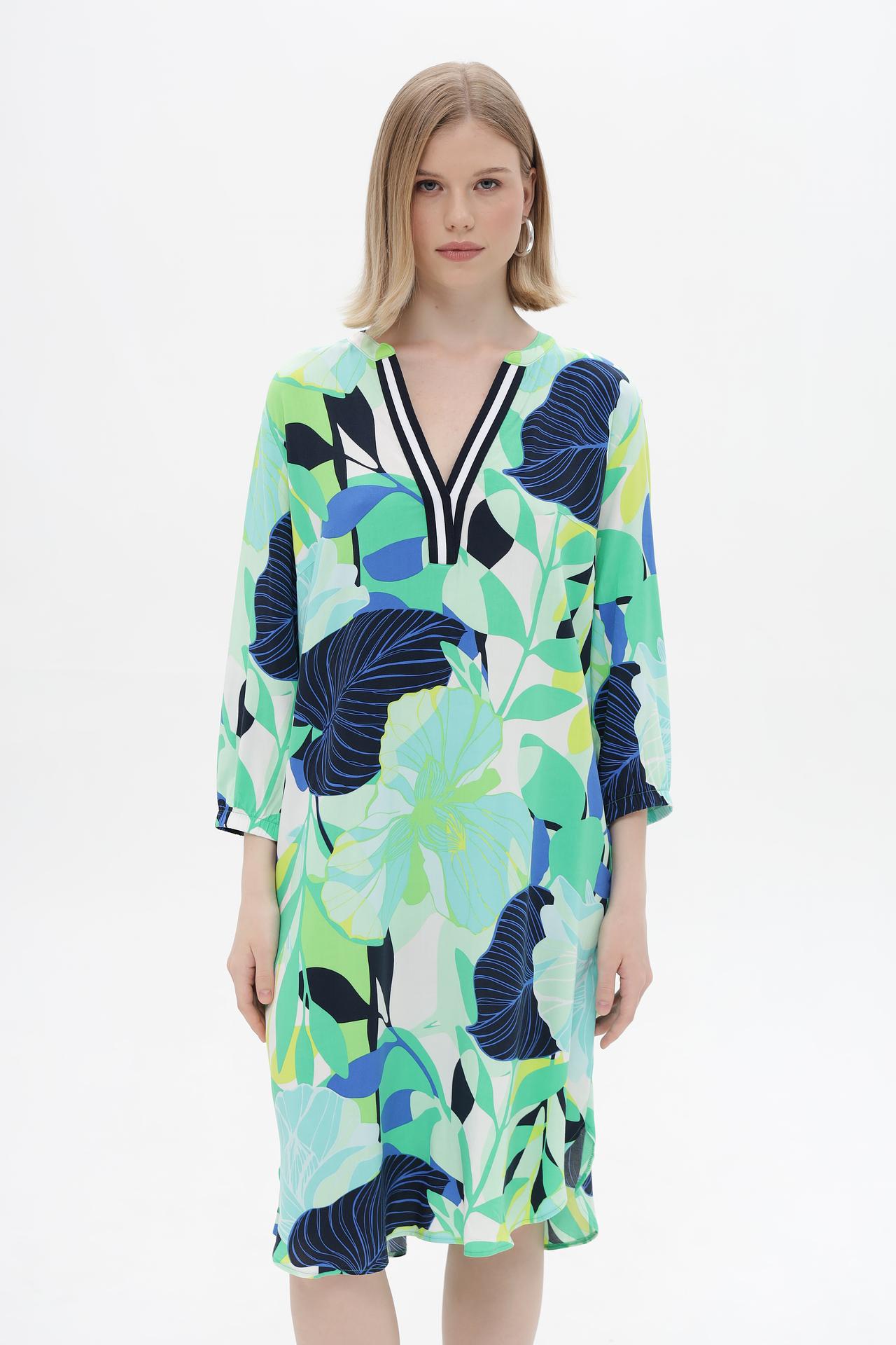 Насладитесь комфортом и стилем с платьем Betty Barclay из 100% вискозы. Модель свободного кроя идеально подходит для создания легких и непринужденных летних образов. Яркий тропический принт с крупными листьями в оттенках зеленого, синего и белого придает изделию свежий и жизнерадостный вид, а V-образный вырез с контрастной полосатой окантовкой добавляет изюминку.