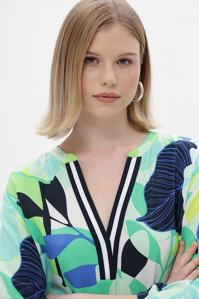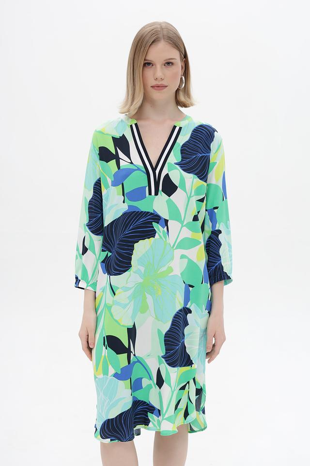 Платье имеет свободный крой, который не сковывает движения и подходит для разных типов фигур. V-образный вырез горловины подчеркивает элегантность силуэта, а рукава длиной 3/4 делают модель универсальной для любой погоды.