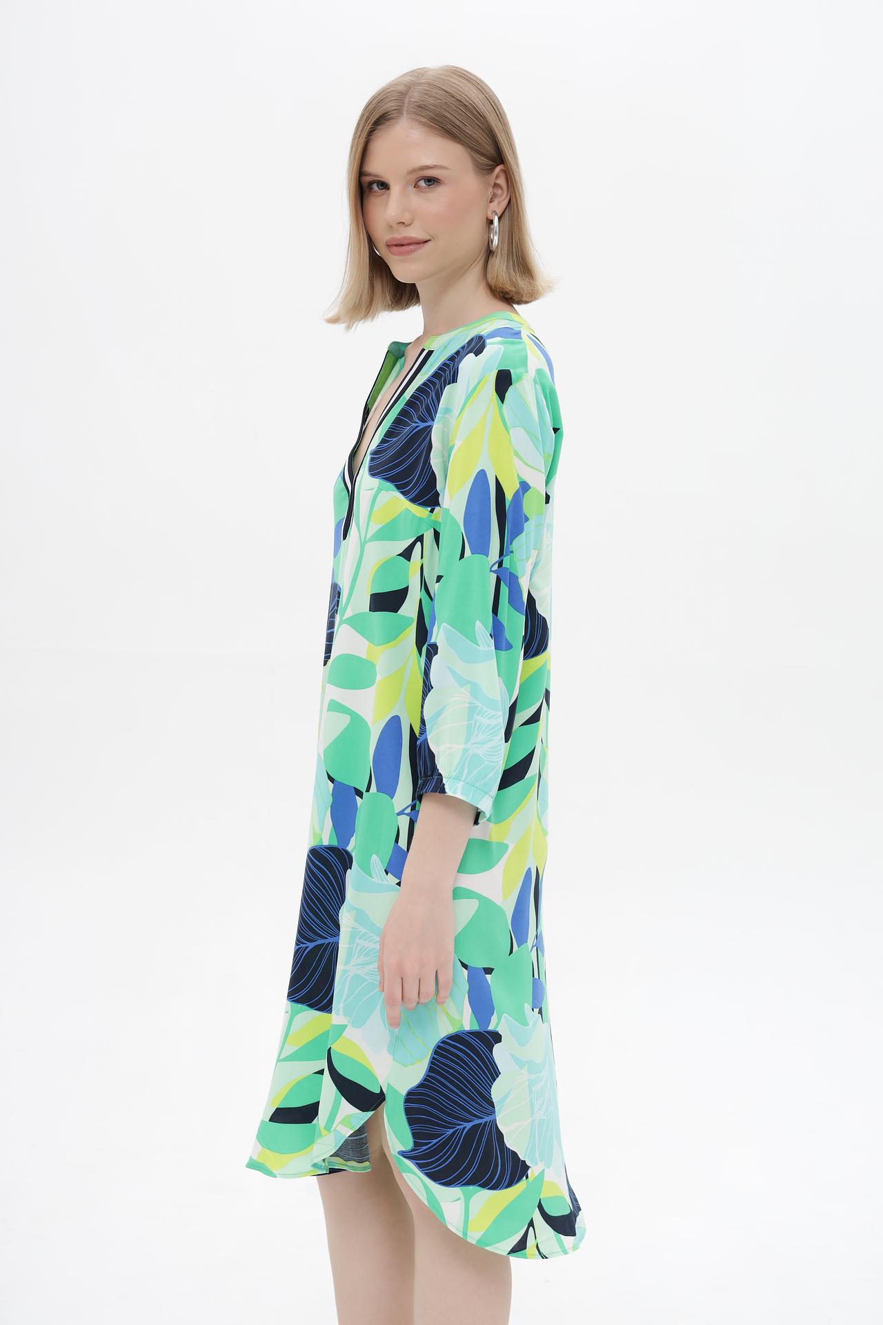 - Яркий тропический принт: Дизайн с выразительными тропическими листьями в насыщенных оттенках зеленого и синего создает летнее настроение. Этот стильный принт привлекает внимание и освежает образ.