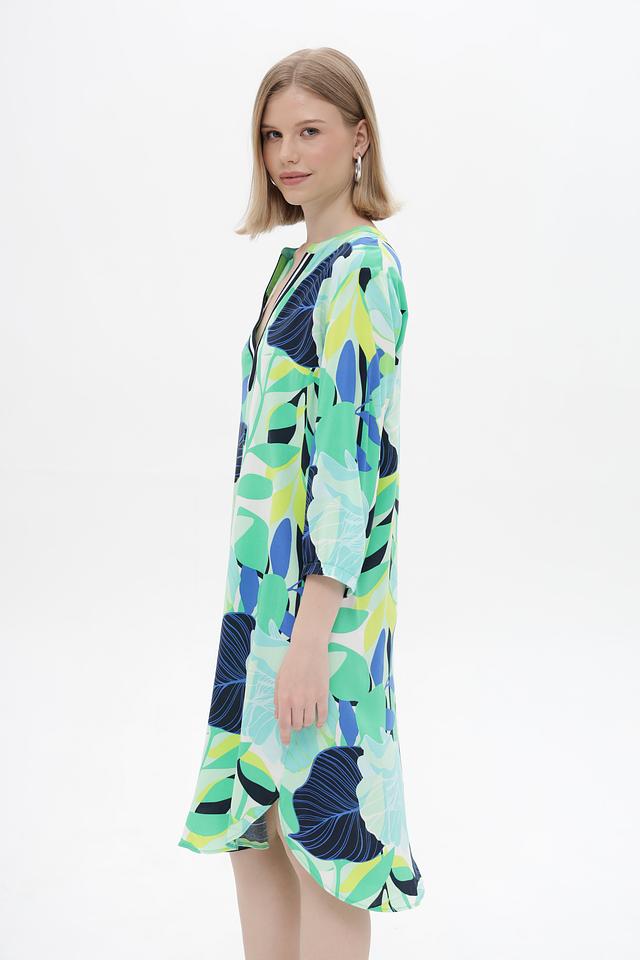 Особое внимание привлекает яркий тропический принт, выполненный в оттенках зеленого, синего и голубого. Этот принт добавит вашему образу свежести и летнего настроения. Платье идеально подходит для повседневной носки, прогулок и летних мероприятий.
