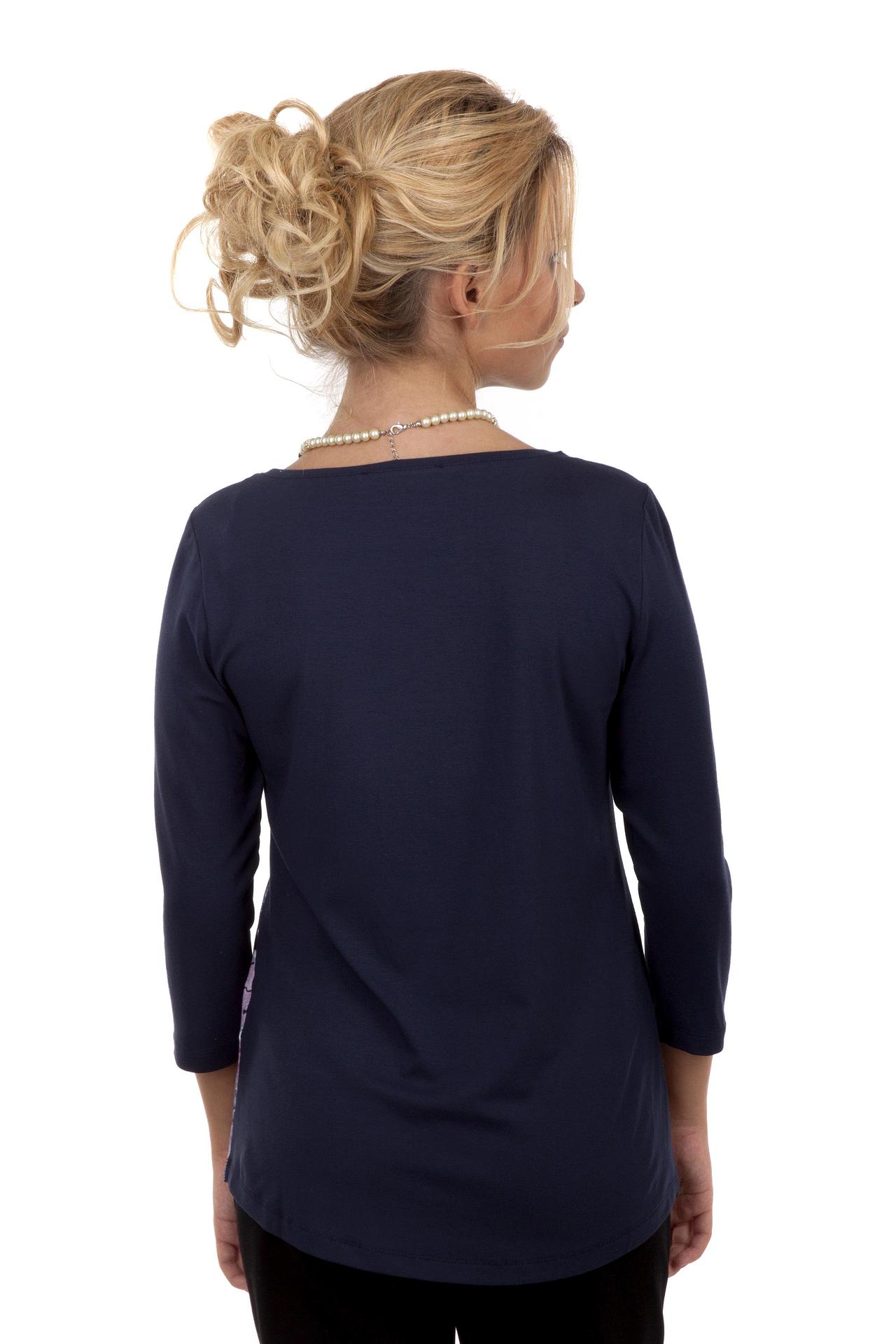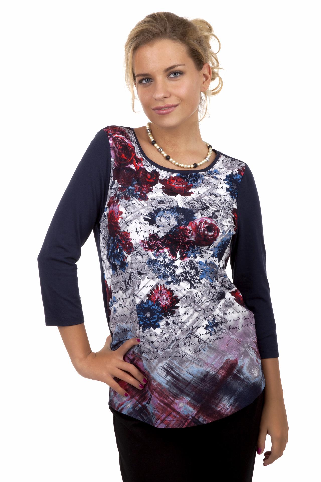 - Дизайн: Яркий цветочный принт на груди и рукава из однотонной ткани. Контрастное сочетание принтованной передней части и однотонных рукавов и спинки создает стильный акцент.