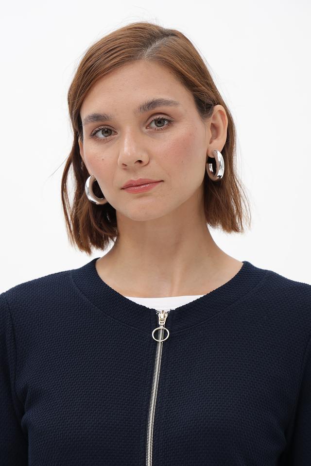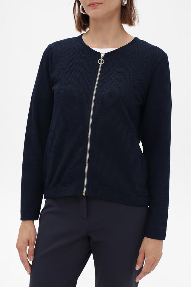 Женский жакет Betty Barclay темно-синего цвета с застежкой на молнию. Изготовлен из мягкого трикотажа с добавлением вискозы и эластана для комфорта и хорошей посадки. Состав: полиэстер 75%, вискоза 22%, эластан 3%