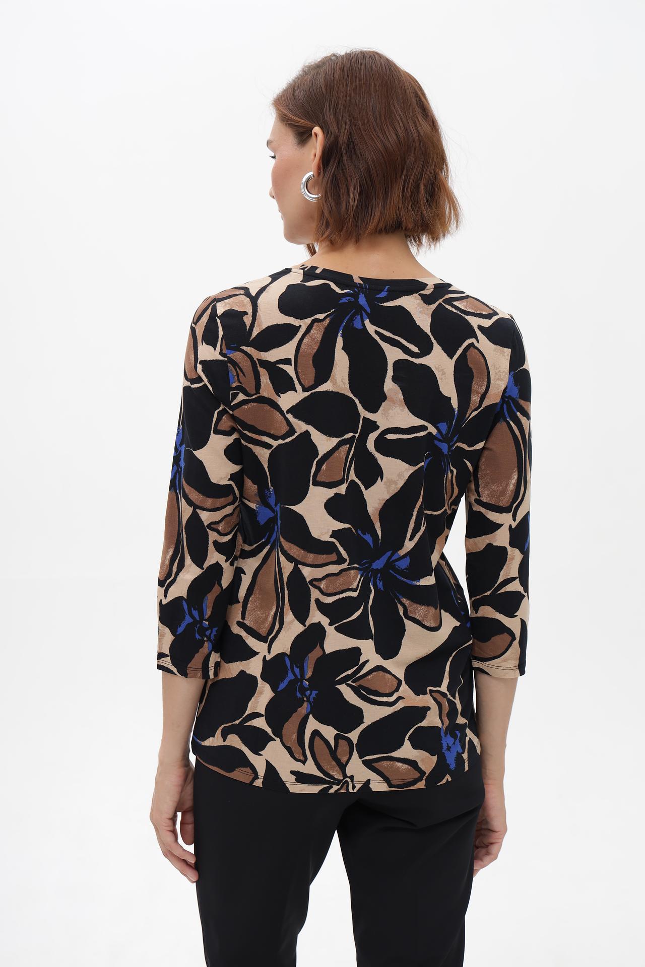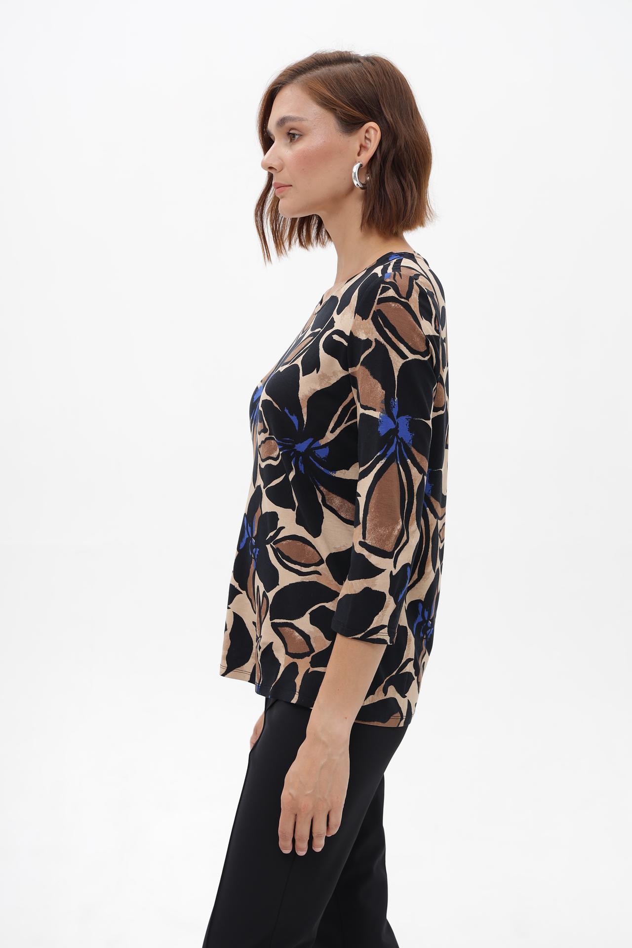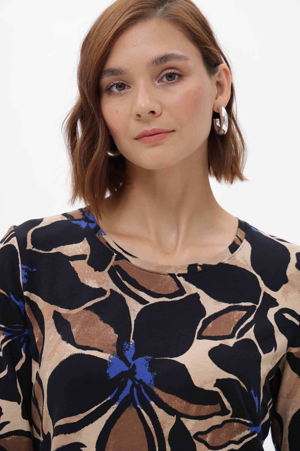 - Дизайн: Очаровательный принт с крупными цветами в контрастных тонах – черный, бежевый, коричневый и синий – создает выразительный и стильный образ. Классический крой с рукавом 3/4 универсален и подходит для любого случая.